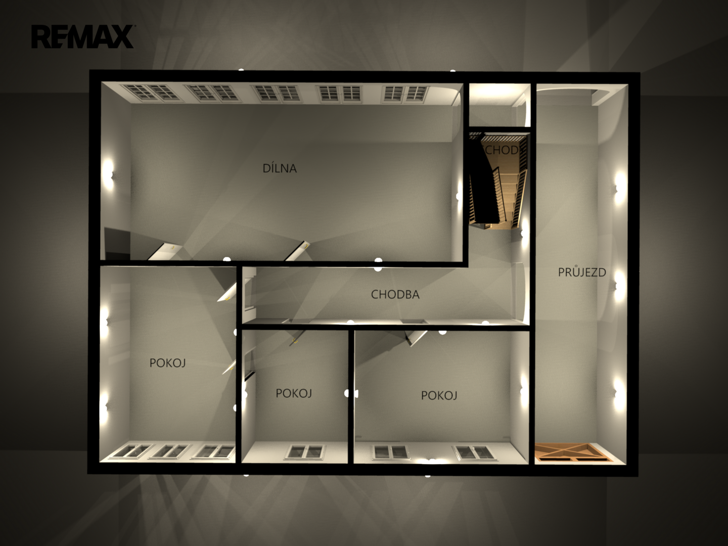 Půda: Prostorný půdní celek nad celým objektem.
