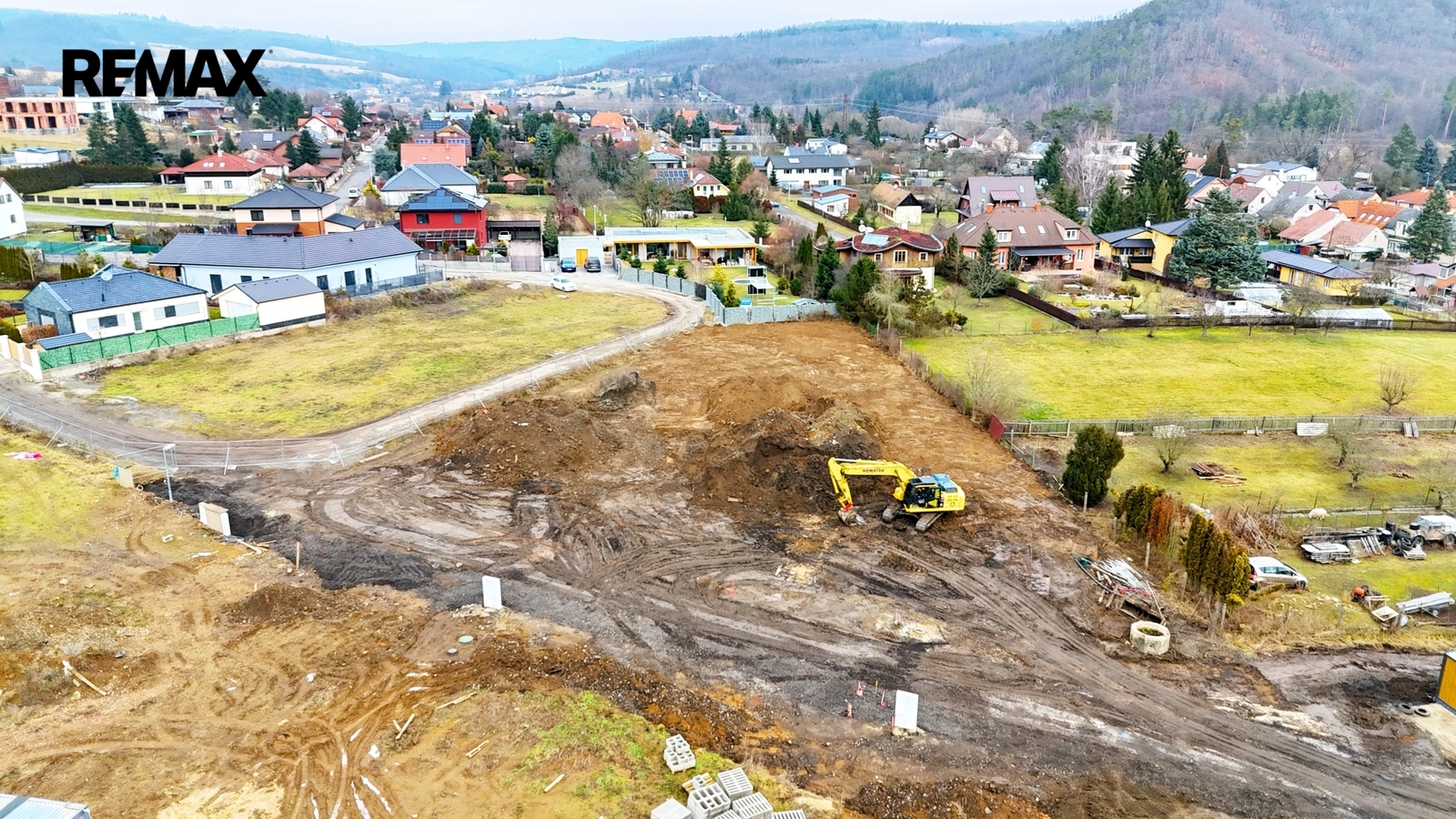 Probíhají poslední terénní úpravy a dokončují se příjezdové komunikace, takže pozemek bude připraven k okamžitému využití.