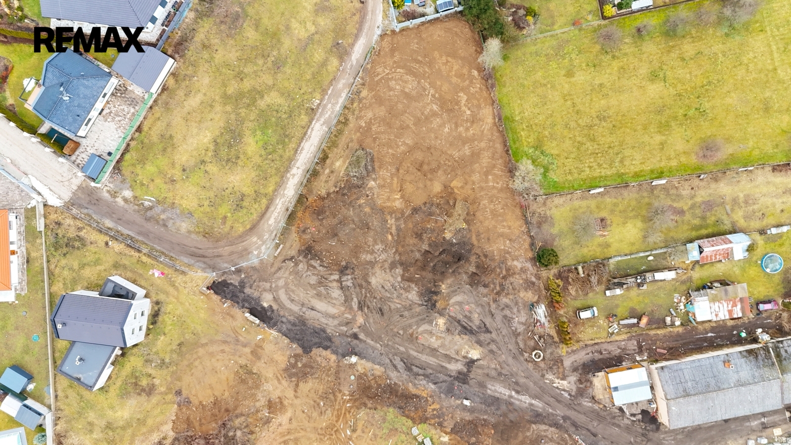 Probíhají poslední terénní úpravy a dokončují se příjezdové komunikace, takže pozemek bude připraven k okamžitému využití.