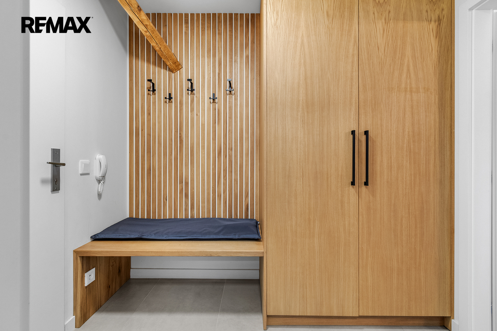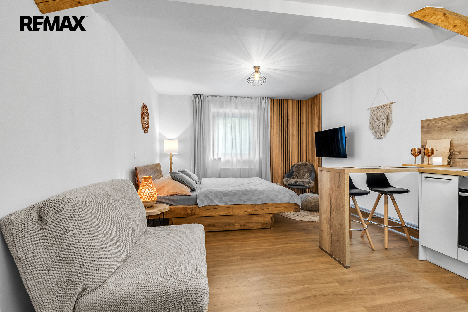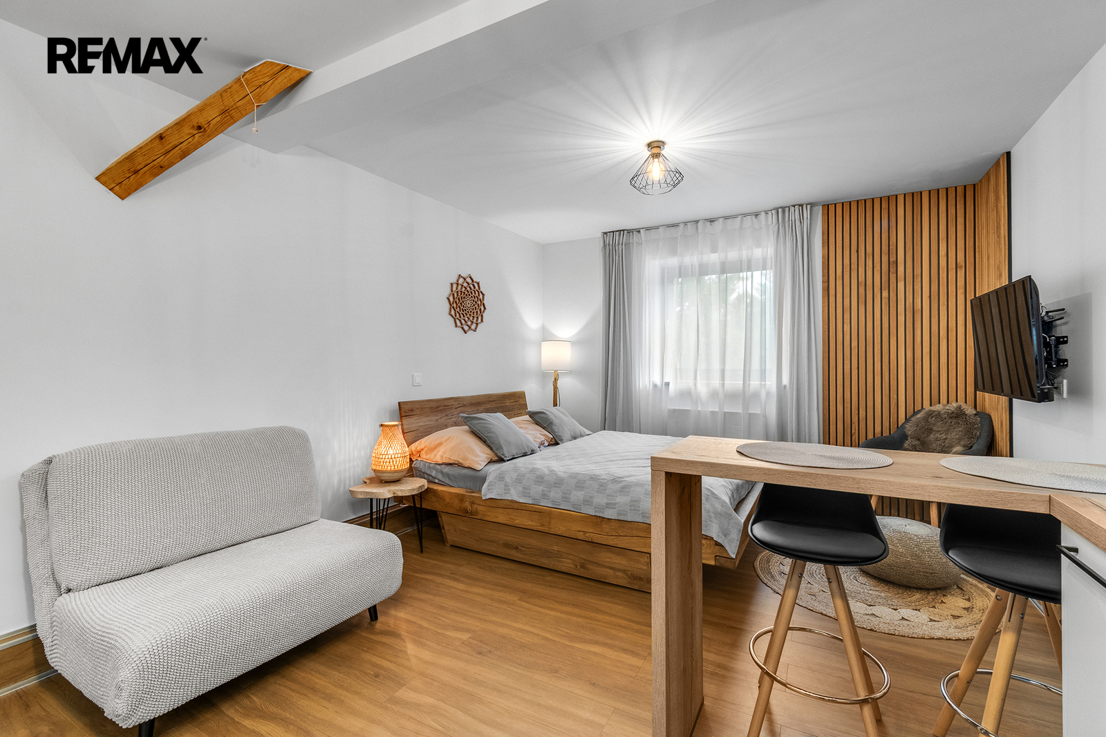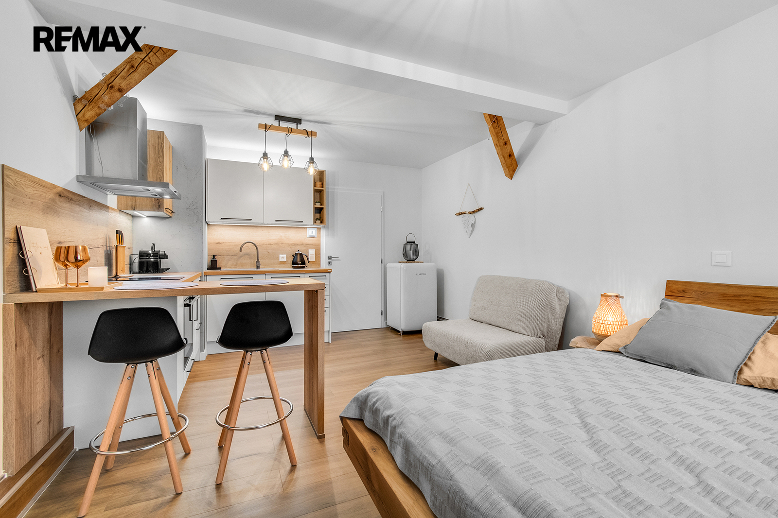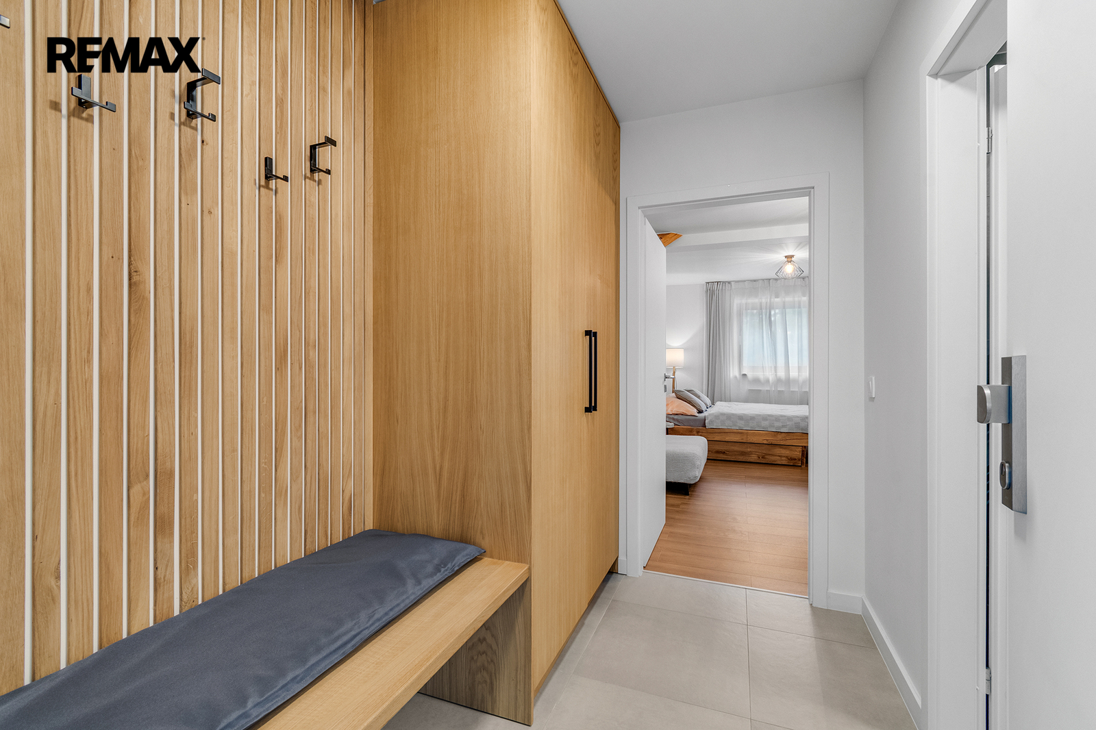 Interiér je řešen velmi prakticky a zároveň stylově – k dispozici je vstupní předsíň s vestavěnou skříní a dřevěnou šatní stěnou, moderní koupelna se sprchovým koutem a toaletou a hlavní obytný prostor propojující obývací část, ložnici a kuchyňský kout. Samozřejmostí je kompletní vybavení, díky kterému je apartmán připraven k okamžitému užívání i pronájmu.
