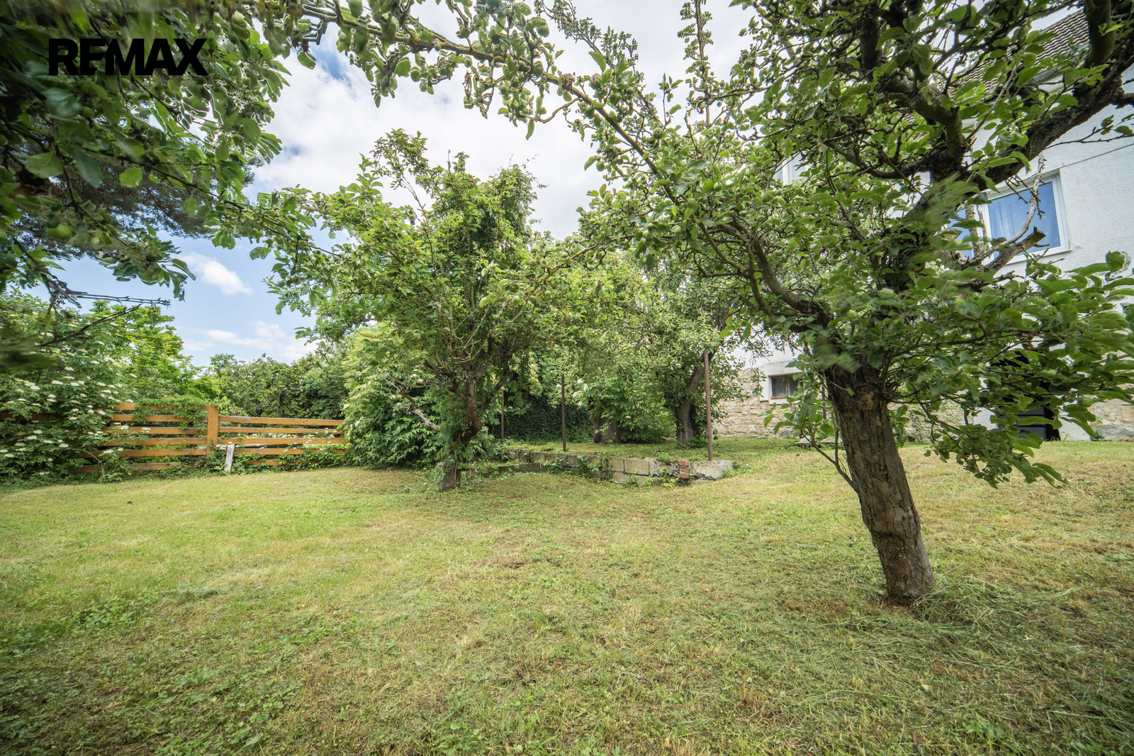 Pozemek je oplocený, jsou na něm vzrostlé ovocné stromy a starší zahradní domek.