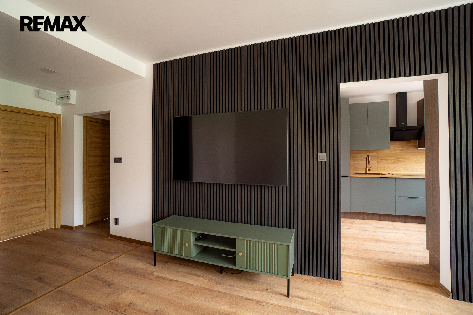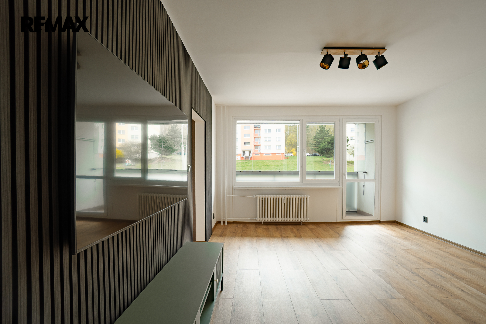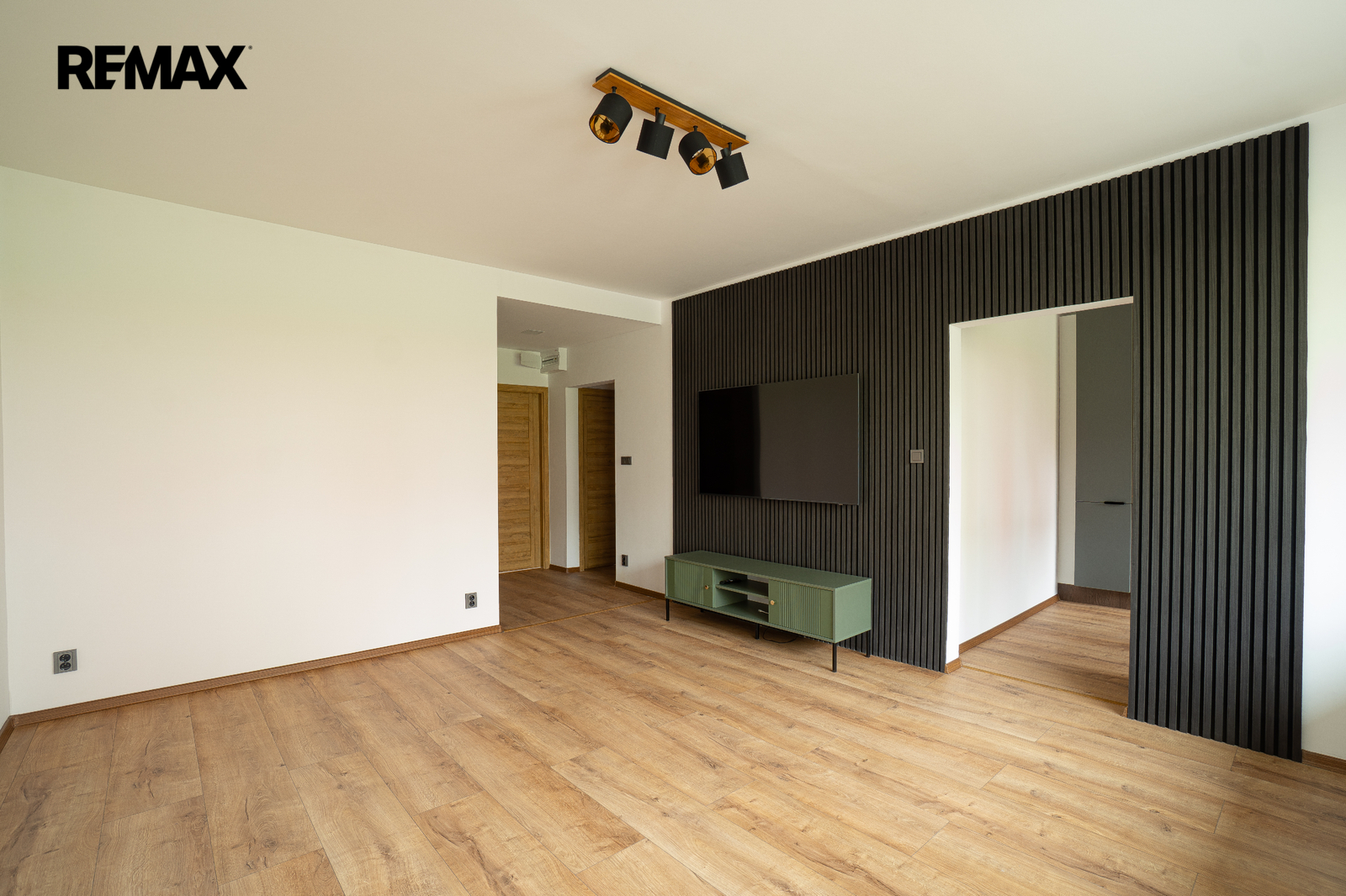 prostorný obývací pokoj s designovými akustickými panely