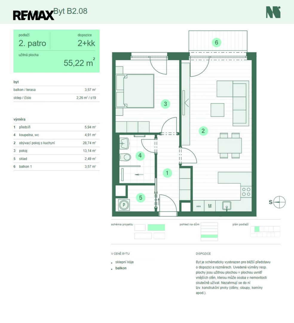 Nabízený byt B2.08 s dispozicí 2kk se nachází ve 2.nadzemním podlaží budovy B1. Užitná plocha samotného bytu je 55,22 m2 plus balkon o celkové výměře 3,57 m2 plus 2,26 m2 komora v suterénu domu. Byt se nabízí bez parkovacího stání, je možné dokoupit venkovní parkovací stání za 476.000,-Kč vč. DPH.