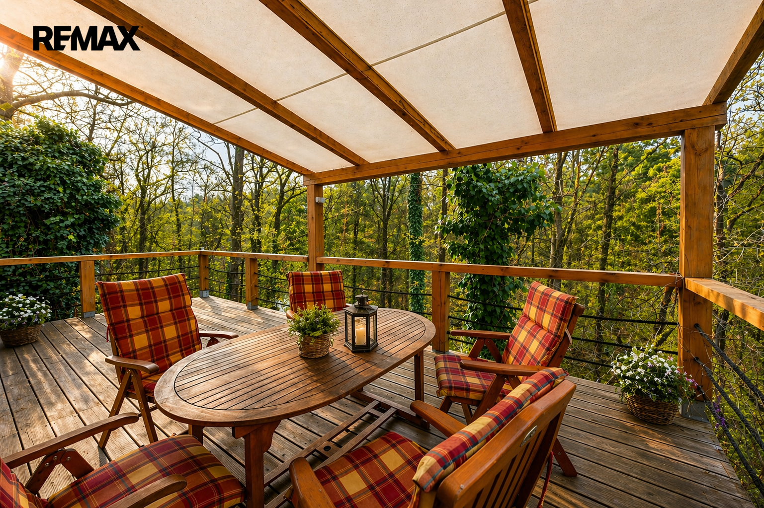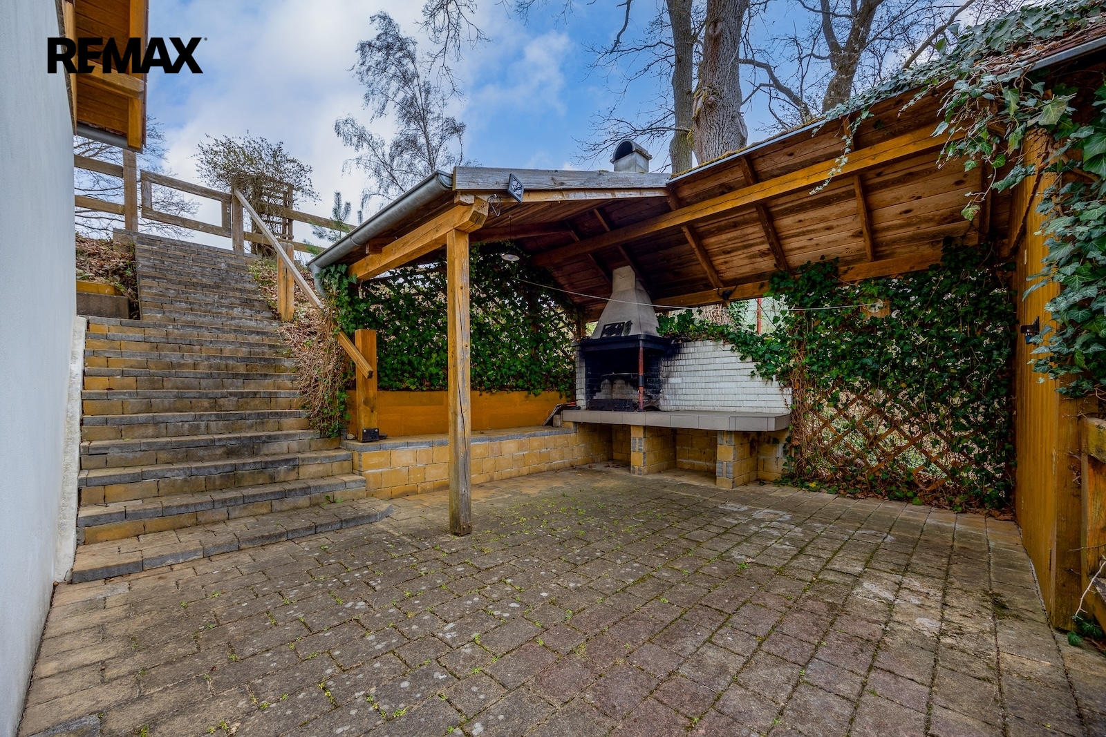Venkovní část domu přirozeně navazuje na jeho charakter – k dispozici je prostorná bezúdržbová terasa ze sibiřského dubu s pergolou a příjemným posezením. Milovníci grilování ocení venkovní gril, nechybí ani dřevěný sklad pro uložení sezónních věcí a nářadí.
