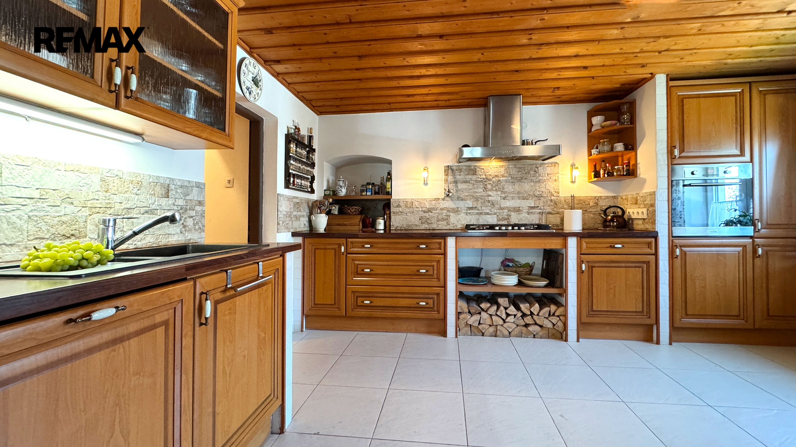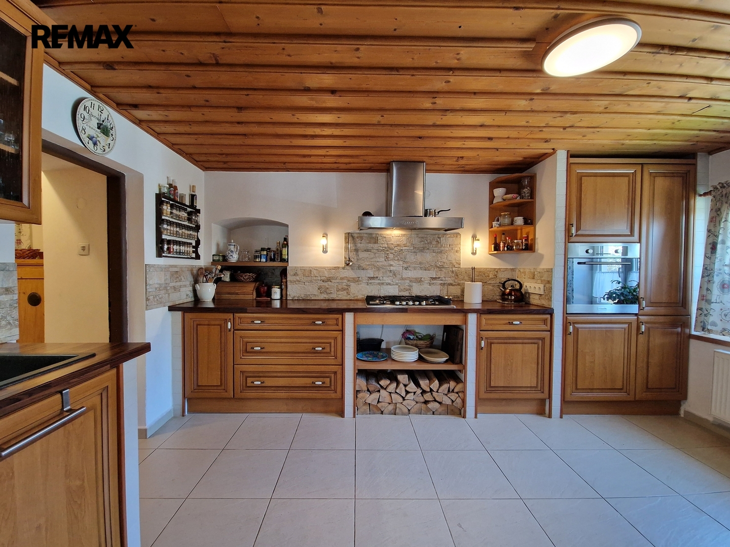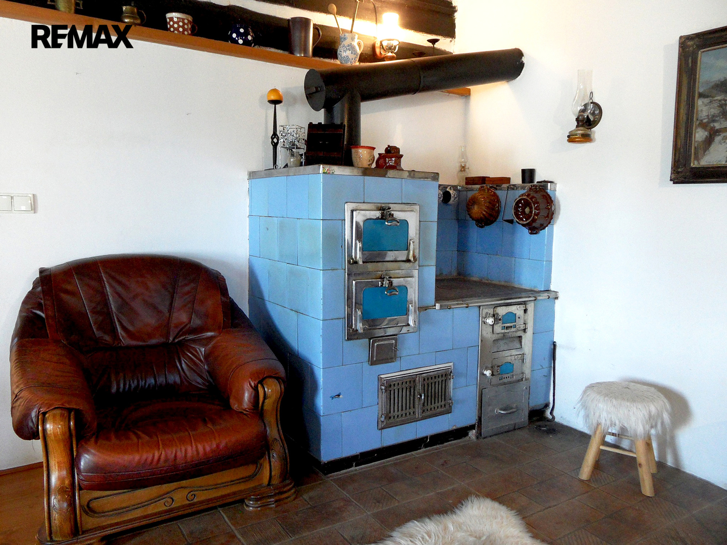 Dominantou domu je nádherná roubená sednice s tradičními kachlovými kamny, dřevěnými trámy a dřevěnou podlahou, ze které se vstupuje do stylové dřevěné kuchyně s prostornou spíží.