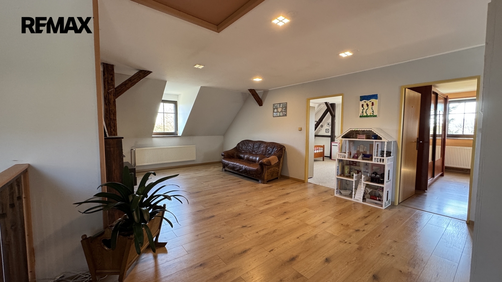Horní patro nabízí velkorysý otevřený prostor, který v současnosti slouží jako společenská místnost, s přípravou na vybudování další kuchyně. Dále zde najdeme 6 ložnic a 2 koupelny s WC, což poskytuje dostatek kapacity pro větší rodinu nebo skupinové ubytování.