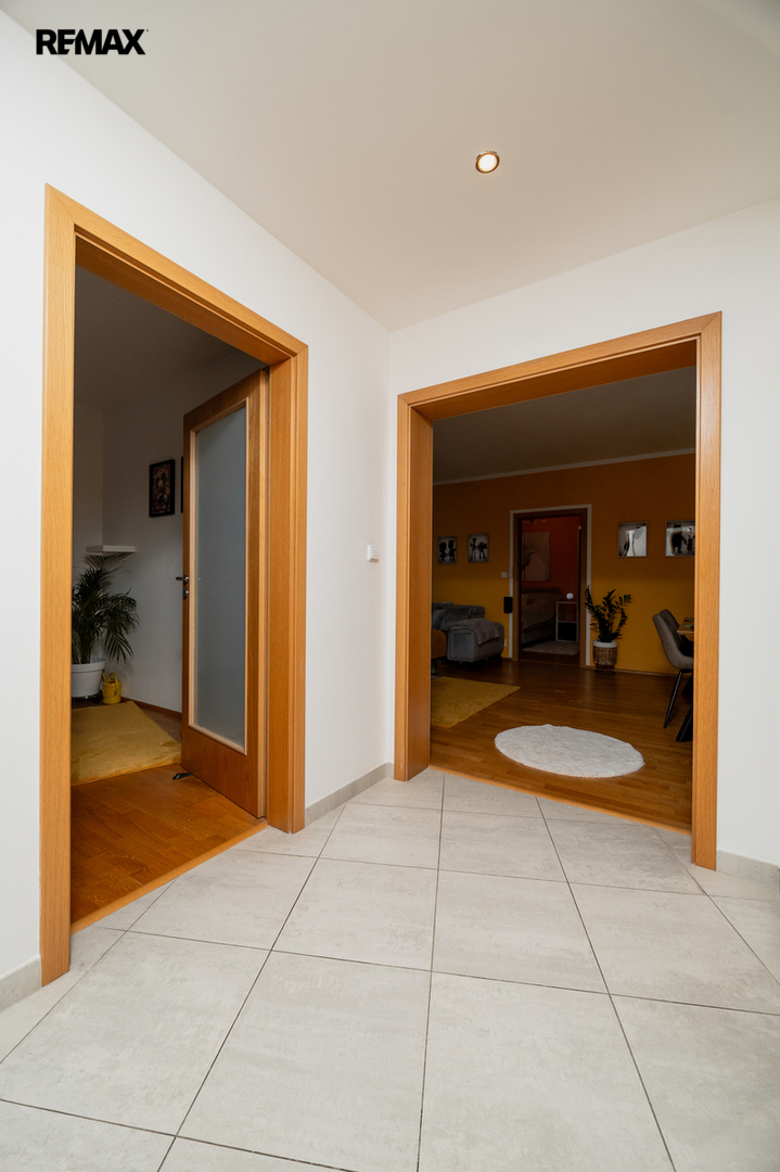 Interiér bytu zahrnuje prostorný obývací pokoj s plně vybaveným kuchyňským koutem, tři ložnice, přičemž jedna z nich má vlastní koupelnu. K dispozici je také společná koupelna s vanou a samostatná toaleta. K bytu patří prostorná úložná komora. Ve všech místnostech jsou krásná francouzská okna, která zajišťují dostatek světla. V bytě není balkon.