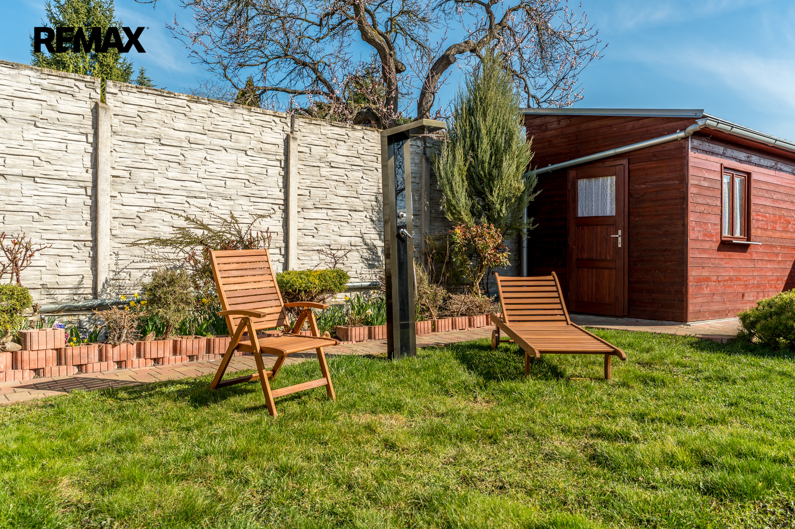 Zahrada je udržovaná a nabízí praktické zázemí, včetně venkovní toalety a solární sprchy.