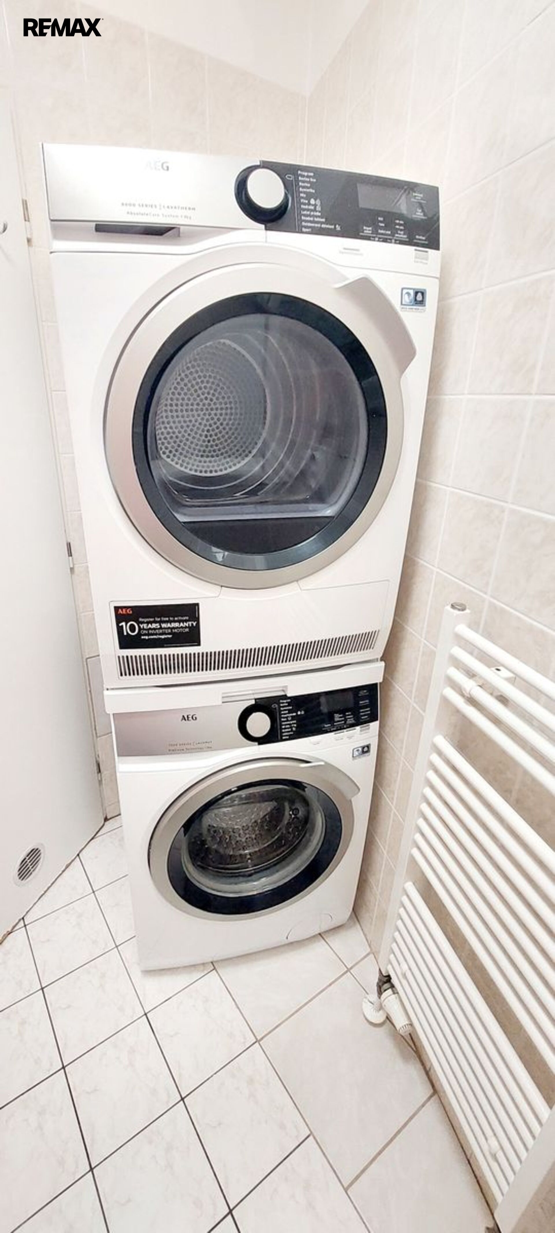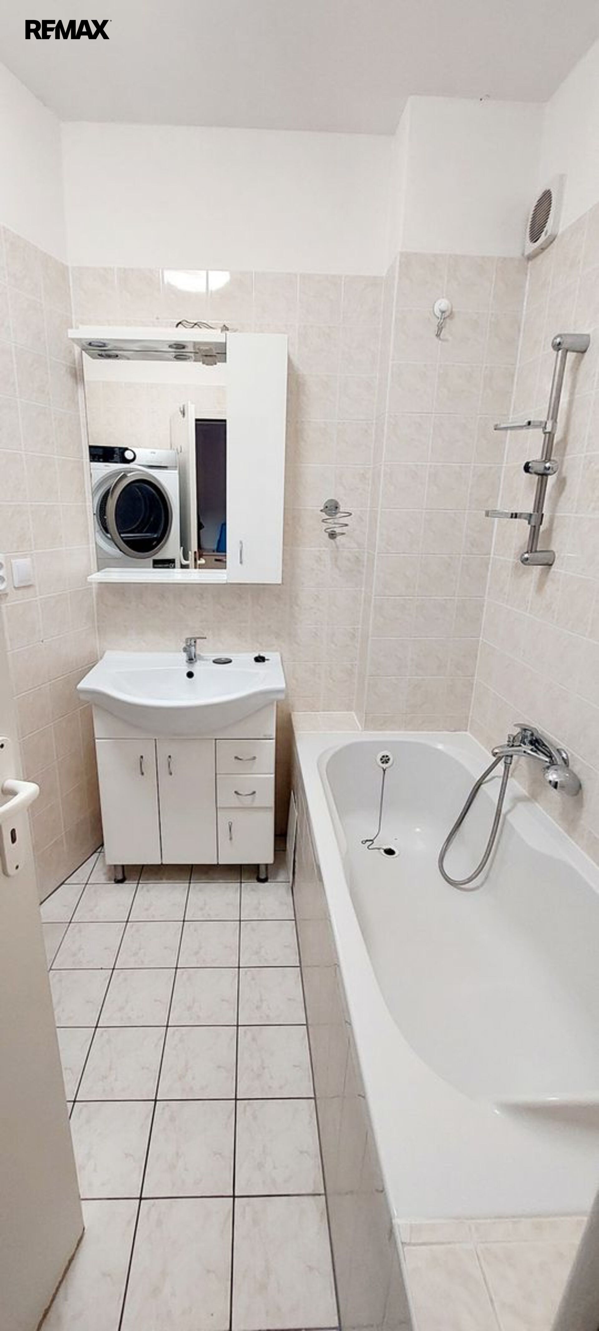 Koupelna je vybavena vanou a umyvadlem, k dispozici pračka se sušičkou.