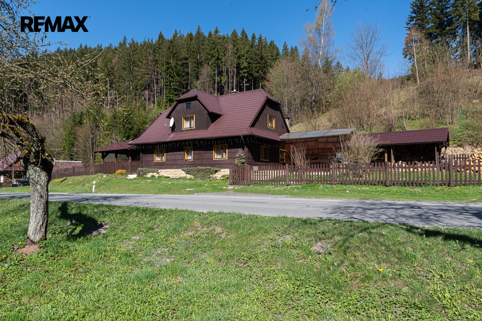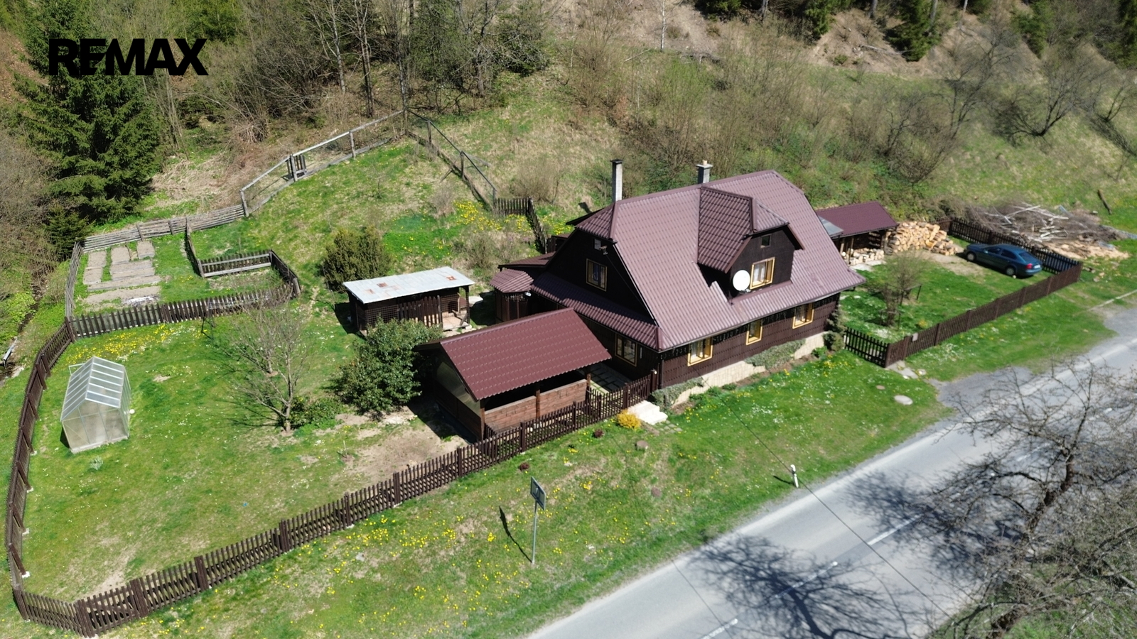 Součástí je také praktická šopa na dřevo a pergola pro příjemné venkovní posezení.