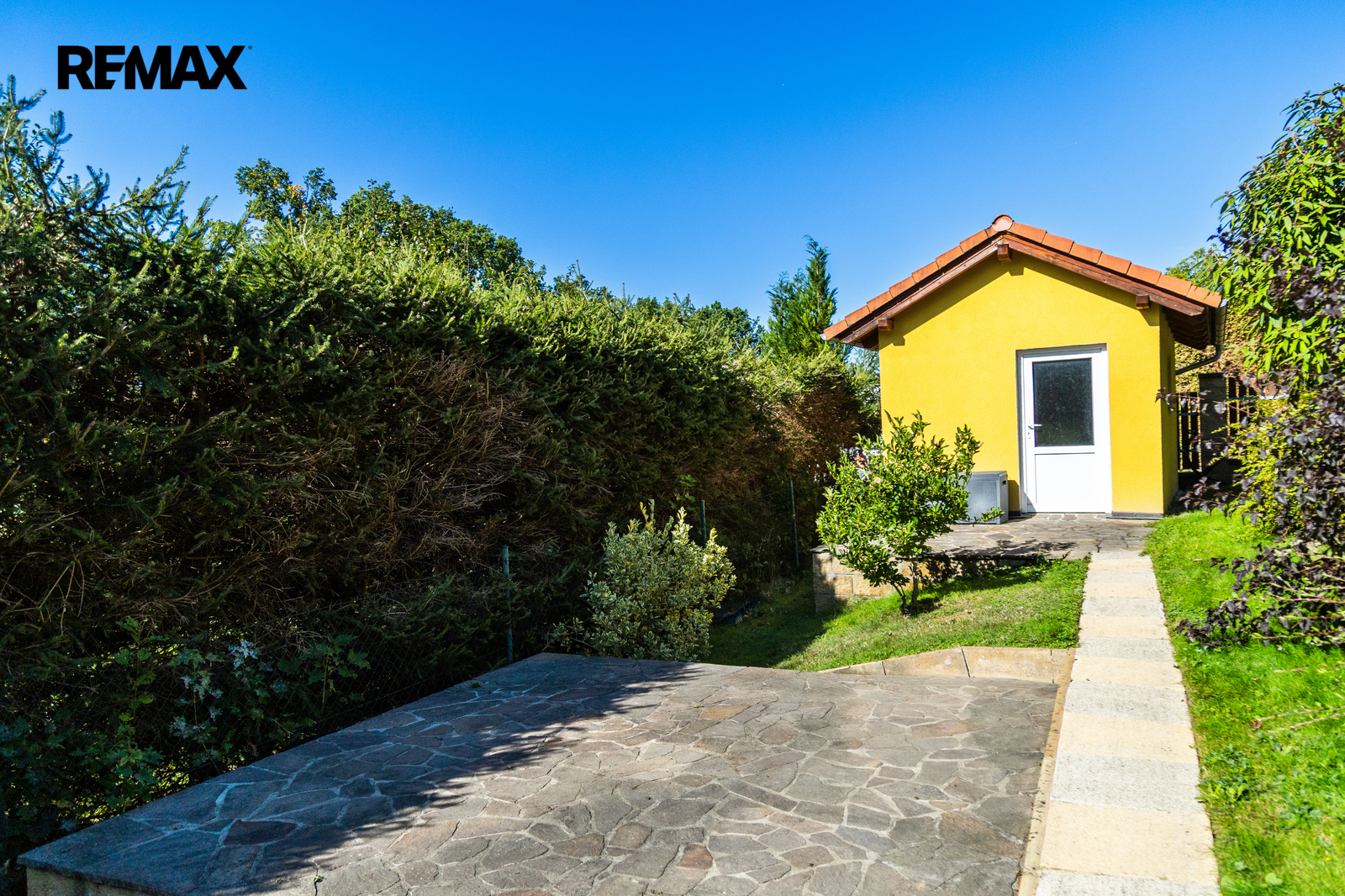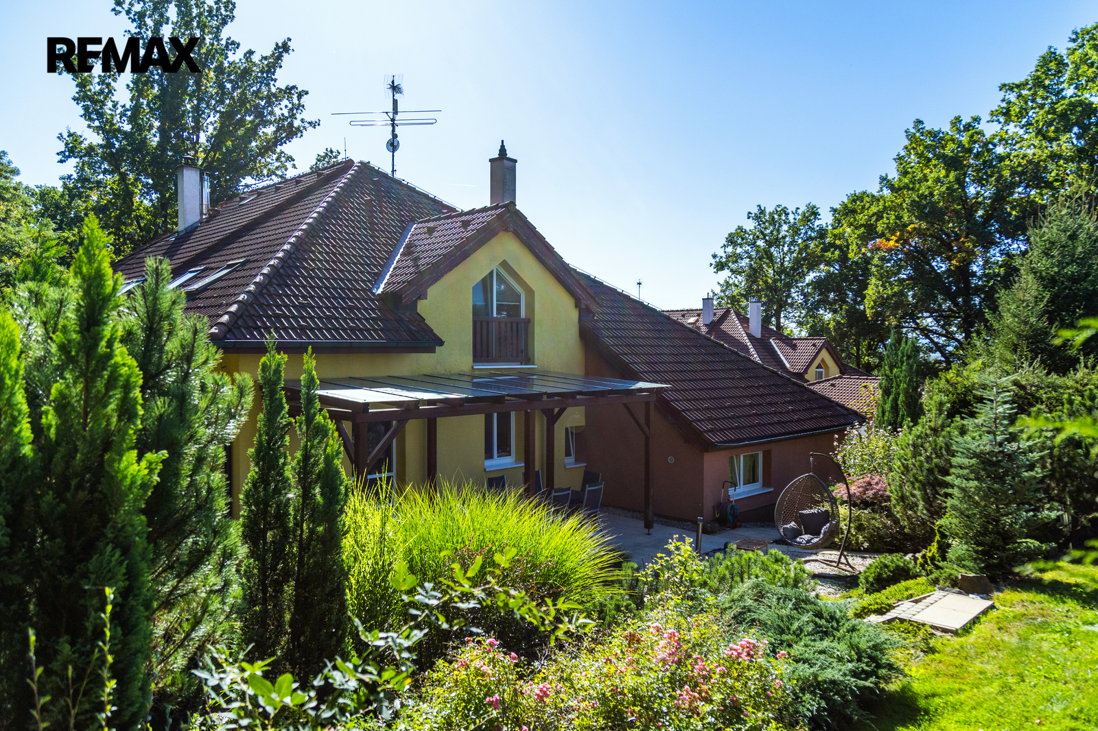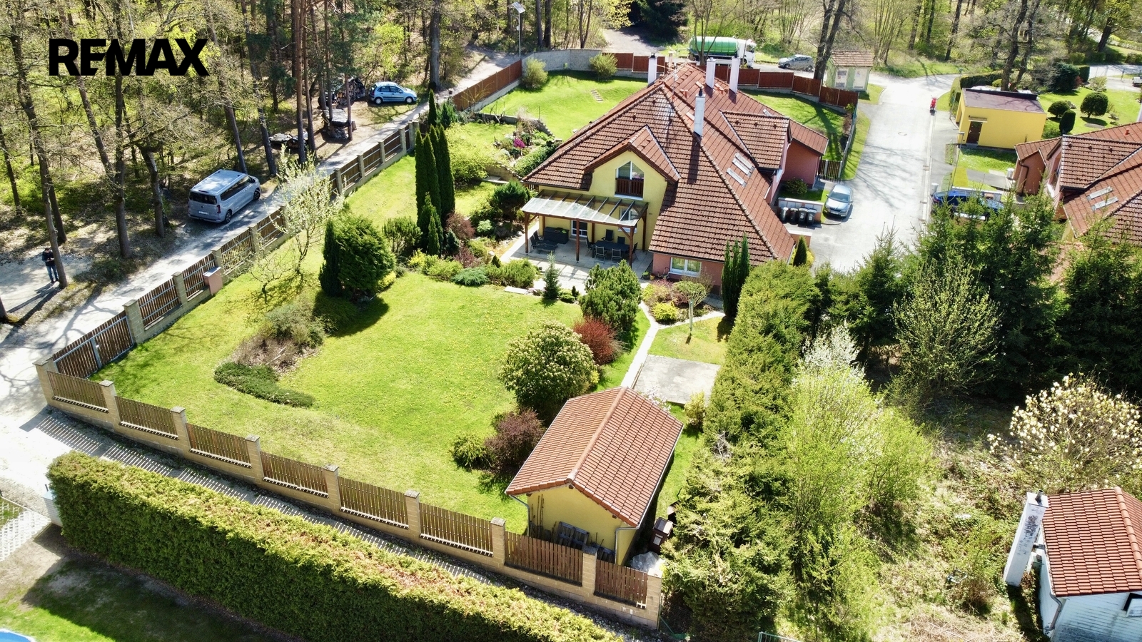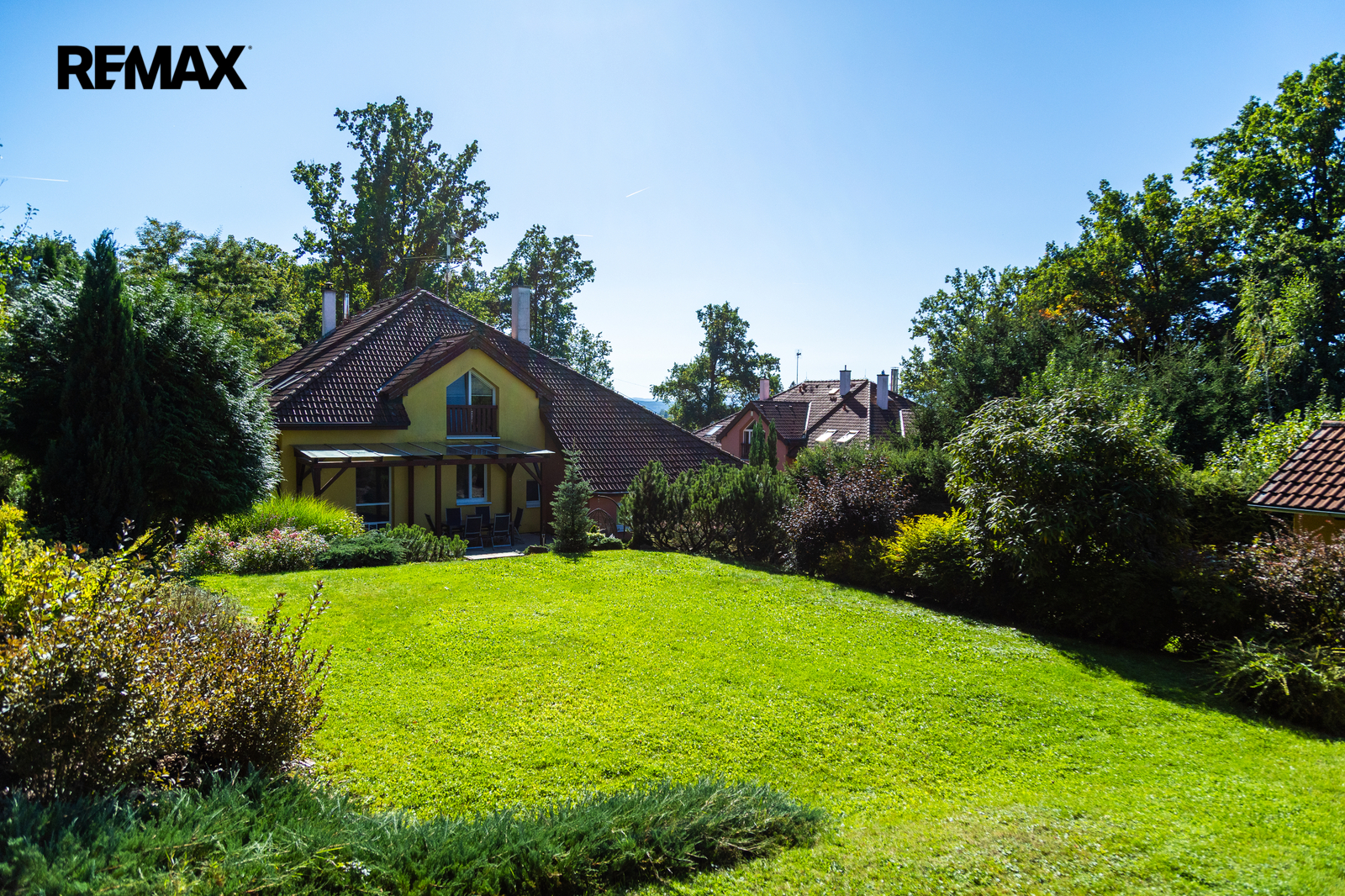 K domu náleží krásná udržovaná 753m2 velká zahrada, která poskytuje příjemné soukromí pro rodinné posezení. K dispozici je krytá terasa pro odpočinek za každého počasí a praktický zahradní domek.