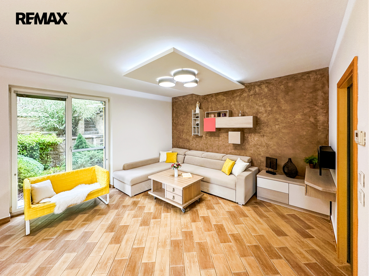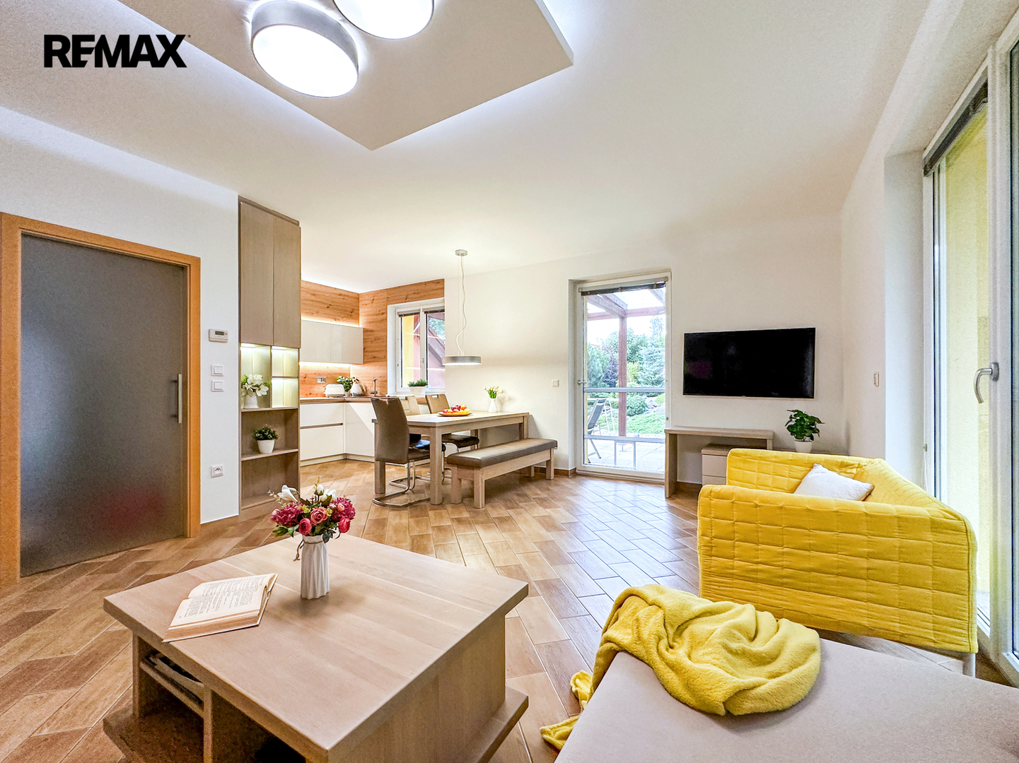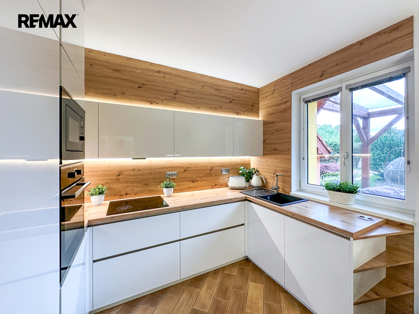 Přízemí: Centrum domova tvoří prostorný obývací pokoj s kuchyňským koutem. Kuchyňská linka byla kompletně zrekonstruována v roce 2015 a nabízí dostatek pracovního prostoru i pro velký rodinný oběd. Dále zde najdete zádveří, technickou místnost, spíž, koupelnu s WC a přímý vstup do garáže (18 m²).
