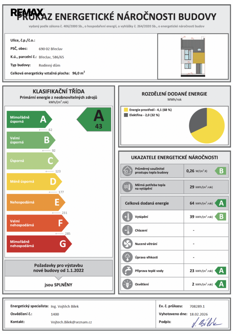 Nemovitost splňuje přísné standardy nejvyšší energetické třídy A, což zajišťuje velmi nízké provozní náklady. Vytápění a ohřev vody jsou řešeny moderním tepelným čerpadlem s vysokou účinností, které je elegantně integrováno v technickém zázemí domu. Konstrukčně se jedná o kvalitní stavbu s důrazem na dlouhou životnost – vápenopískové zdivo v kombinaci se železobetonové prvky zajišťují výborné akumulační vlastnosti a příjemné vnitřní klima po celý rok.
