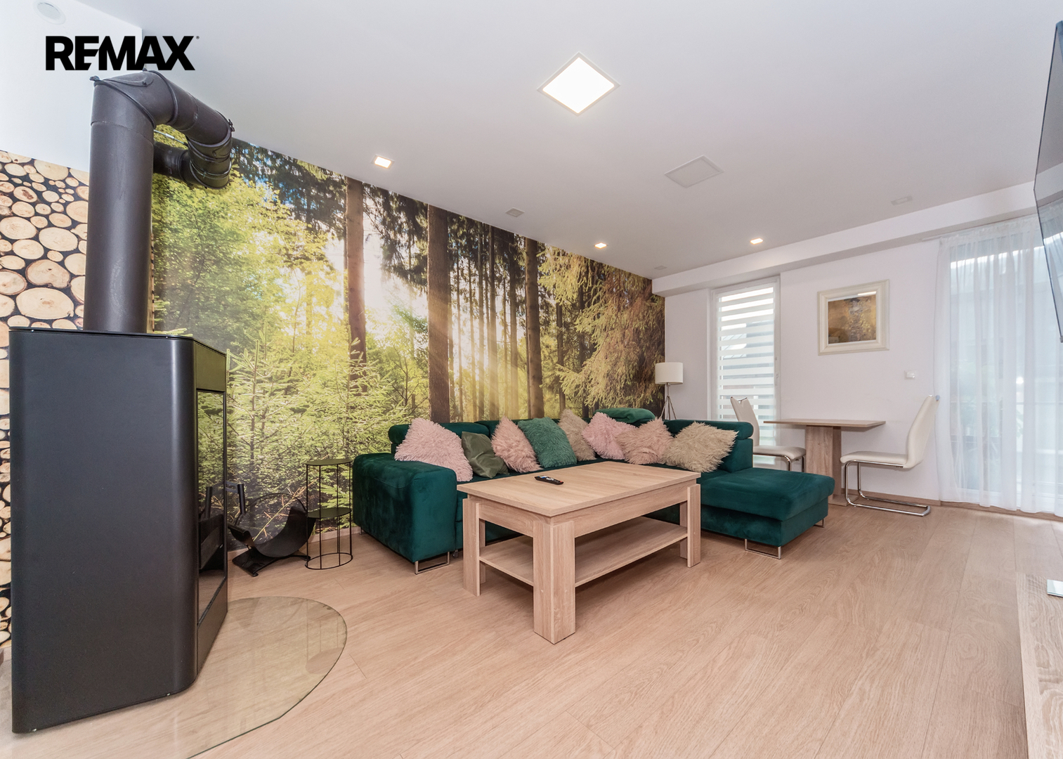 Interiér je laděn v moderním horském stylu s důrazem na přírodní materiály a útulnost. Plně vybavená kuchyň, krb na dřevo a privátní sauna výrazně zvyšují atraktivitu jak pro vlastní užívání, tak pro pronájem.