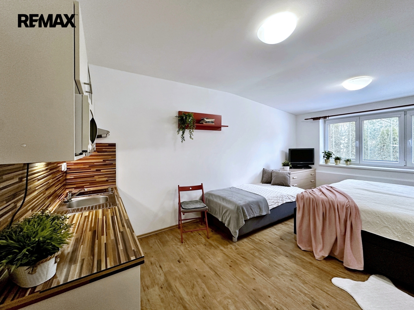Apartmán se skládá z obývací části s kuchyňským koutem, koupelny se sprchovým koutem a toaletou. Součástí prodeje je kompletní vybavení – kuchyňská linka se spotřebiči, nábytek, úložné prostory, televizor a další vybavení. Můžete ihned bydlet nebo pronajímat.