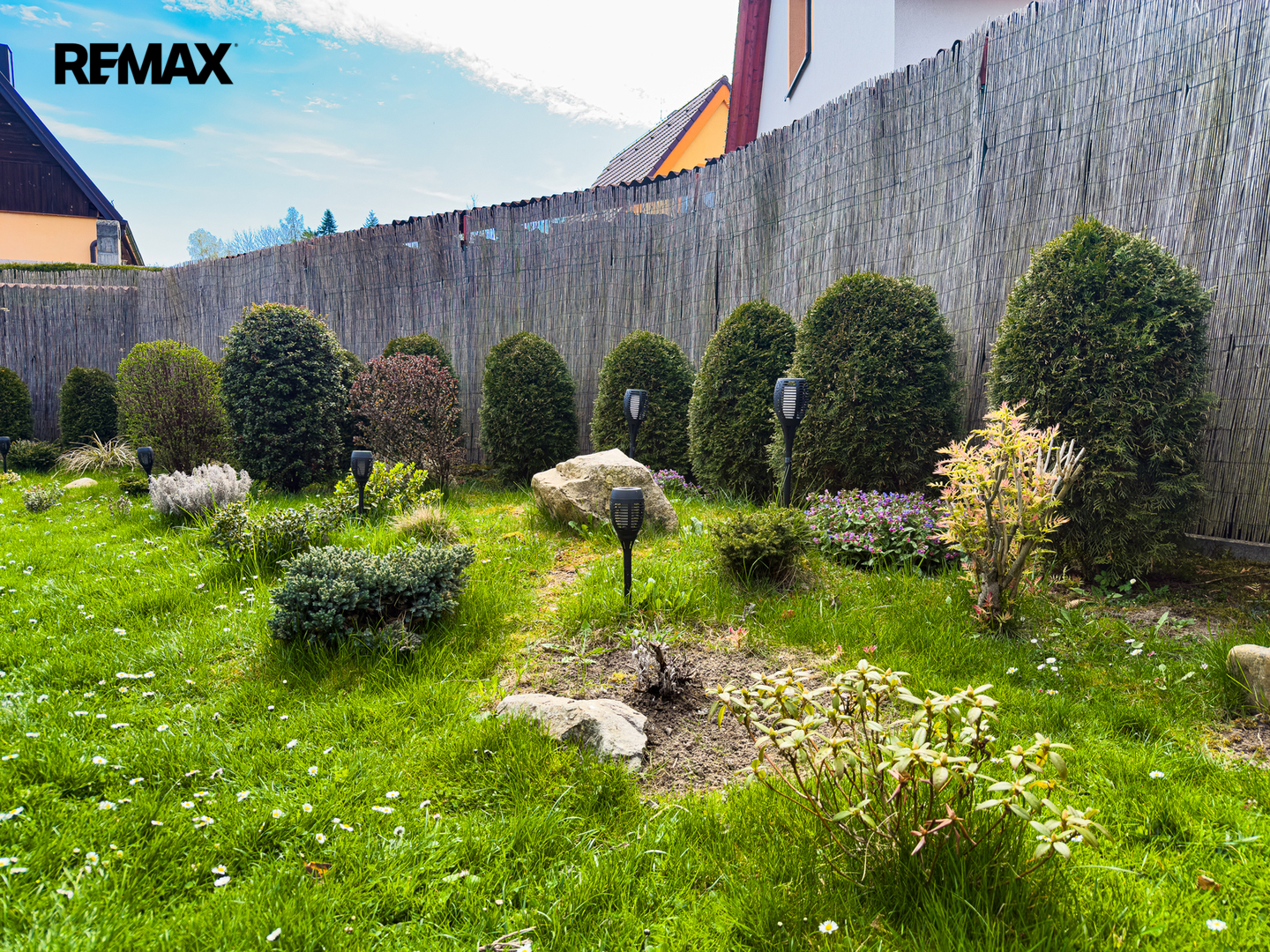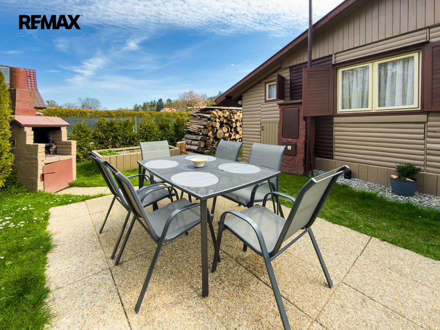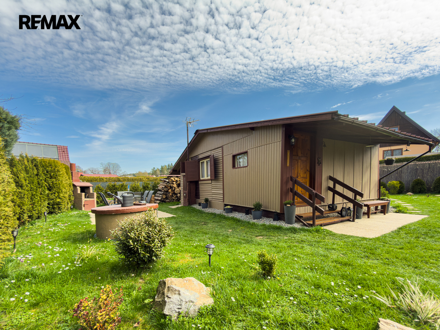 K chatě náleží pronajatá vkusně zařízená a udržovaná zahrada se studnou. K dispozici je venkovní krb ideální pro grilování, pěstební záhony a praktické zázemí v podobě přístřešku na nářadí a samostatného dřevníku.