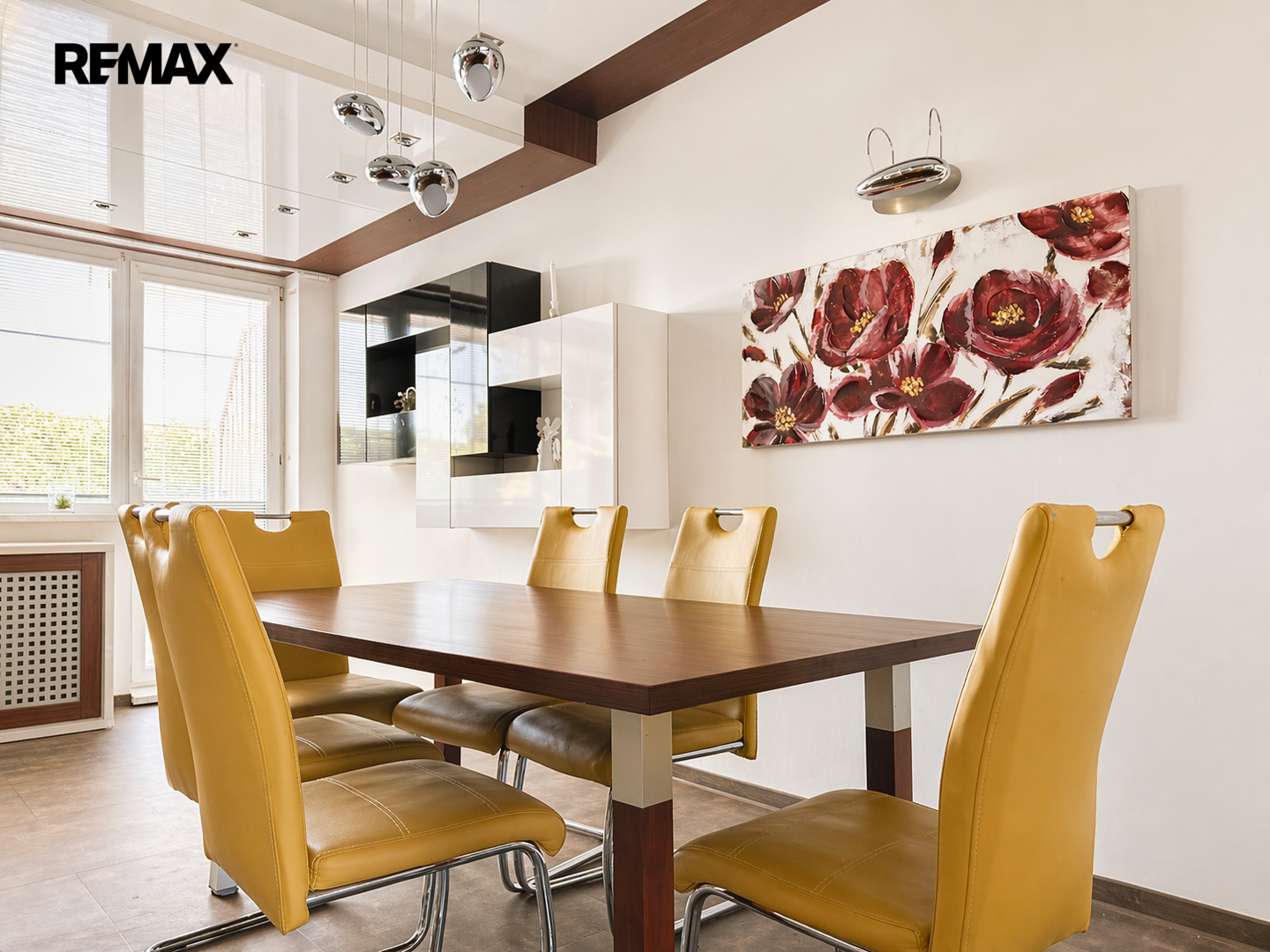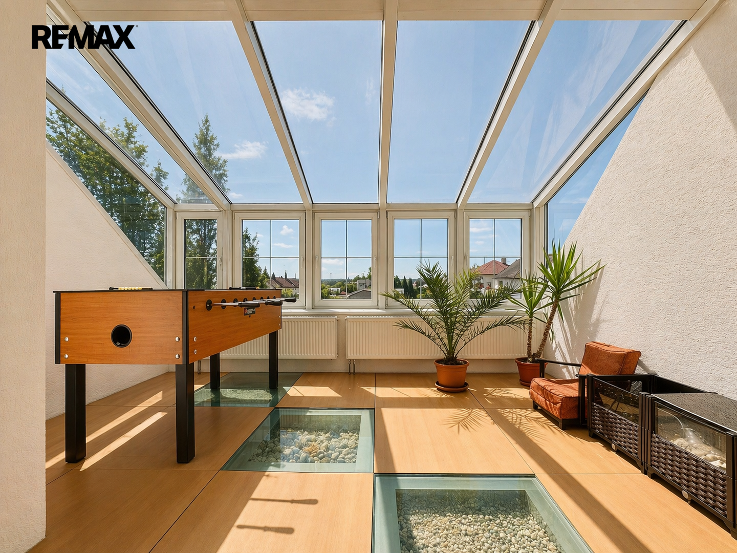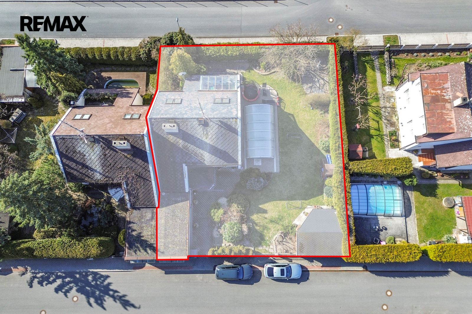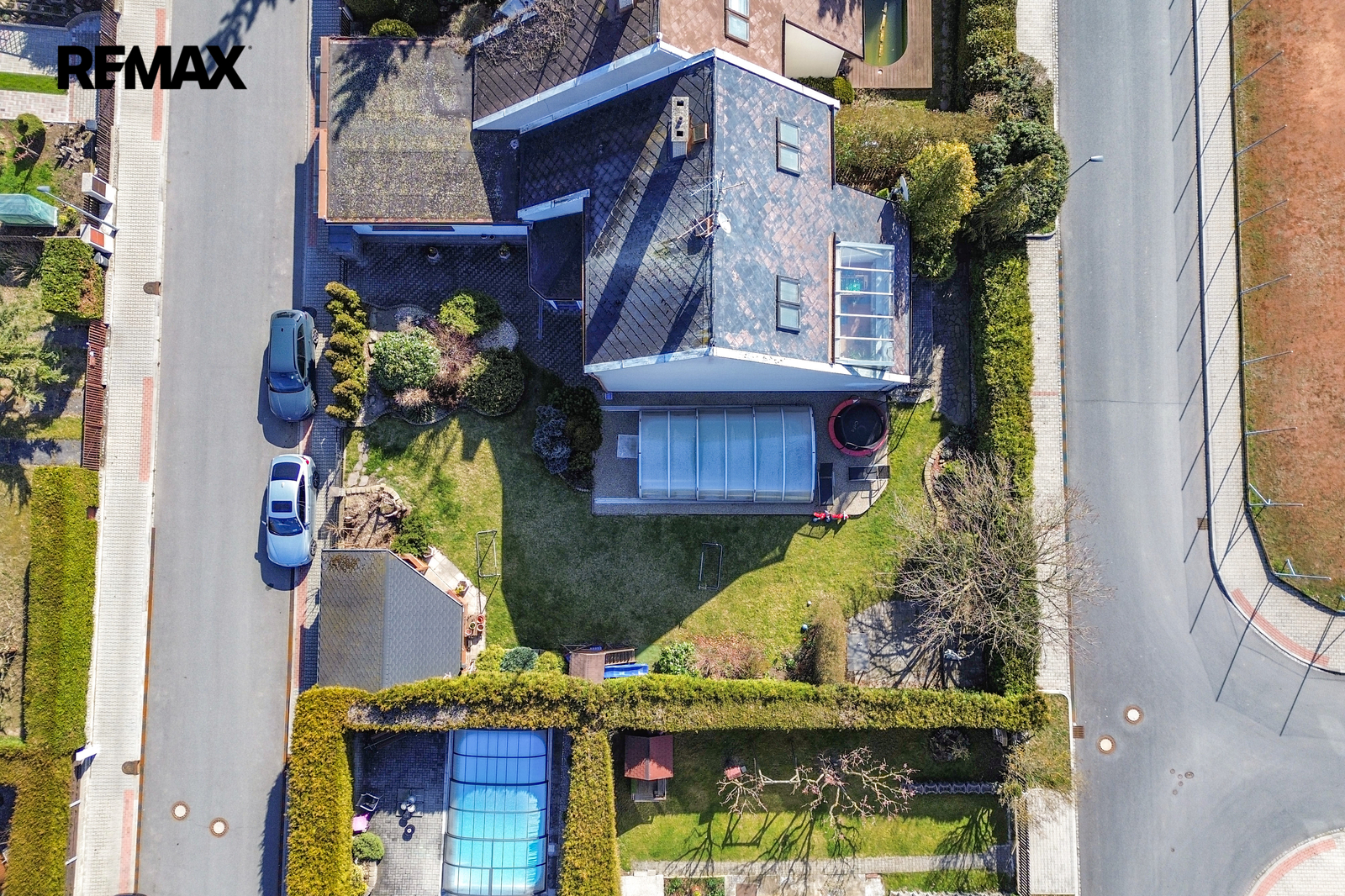 Dům nabízí užitnou plochu přibližně 240 m² rozloženou do tří nadzemních podlaží, dále sklep o velikosti cca 40 m² a garáž s dílnou o ploše cca 30 m². Součástí je zimní zahrada, klimatizované místnosti a celkově velmi udržovaný stav bez nutnosti zásadních investic. Vytápění je řešeno ústředním topením, ohřev vody zajišťuje elektrický bojler, na pozemku se nachází také vlastní studna.
