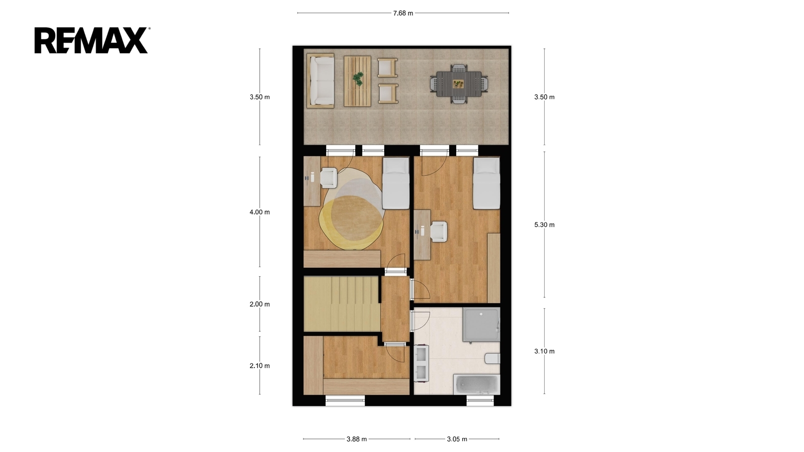V patře pak vzniká klidová zóna se dvěma prostornými ložnicemi, koupelnou a šatnou. Za domem se rozprostírá zahrada s jihozápadní orientací, která nabízí dostatek soukromí, prostor pro relaxaci i rodinné chvíle, doplněná o navržený zahradní domek a parkování.