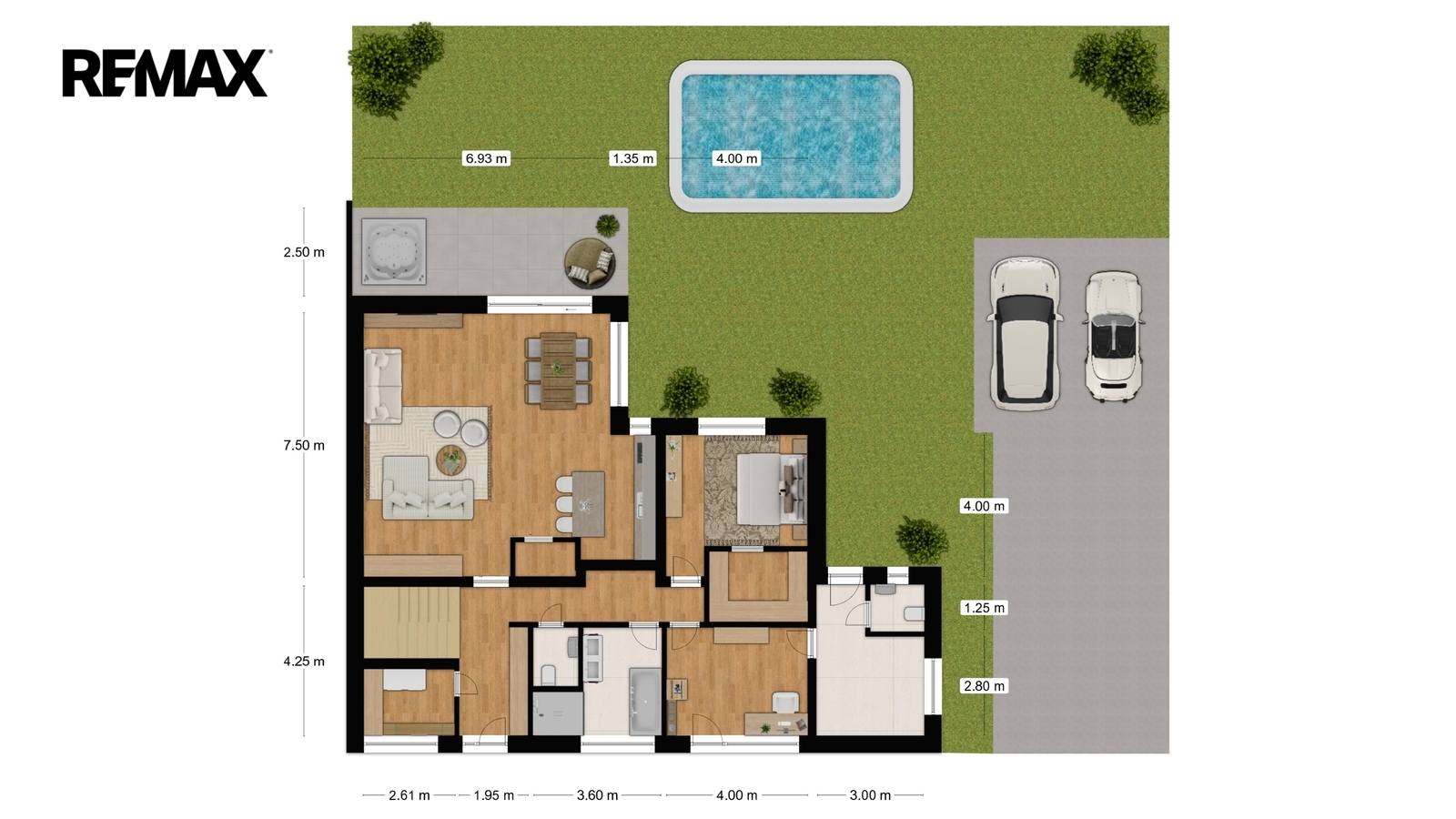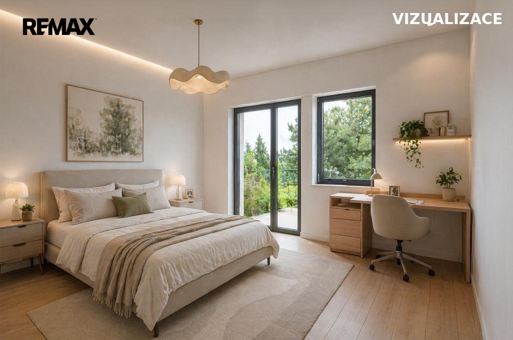 V patře pak vzniká klidová zóna se dvěma prostornými ložnicemi, koupelnou a šatnou. Za domem se rozprostírá zahrada s jihozápadní orientací, která nabízí dostatek soukromí, prostor pro relaxaci i rodinné chvíle, doplněná o navržený zahradní domek a parkování.