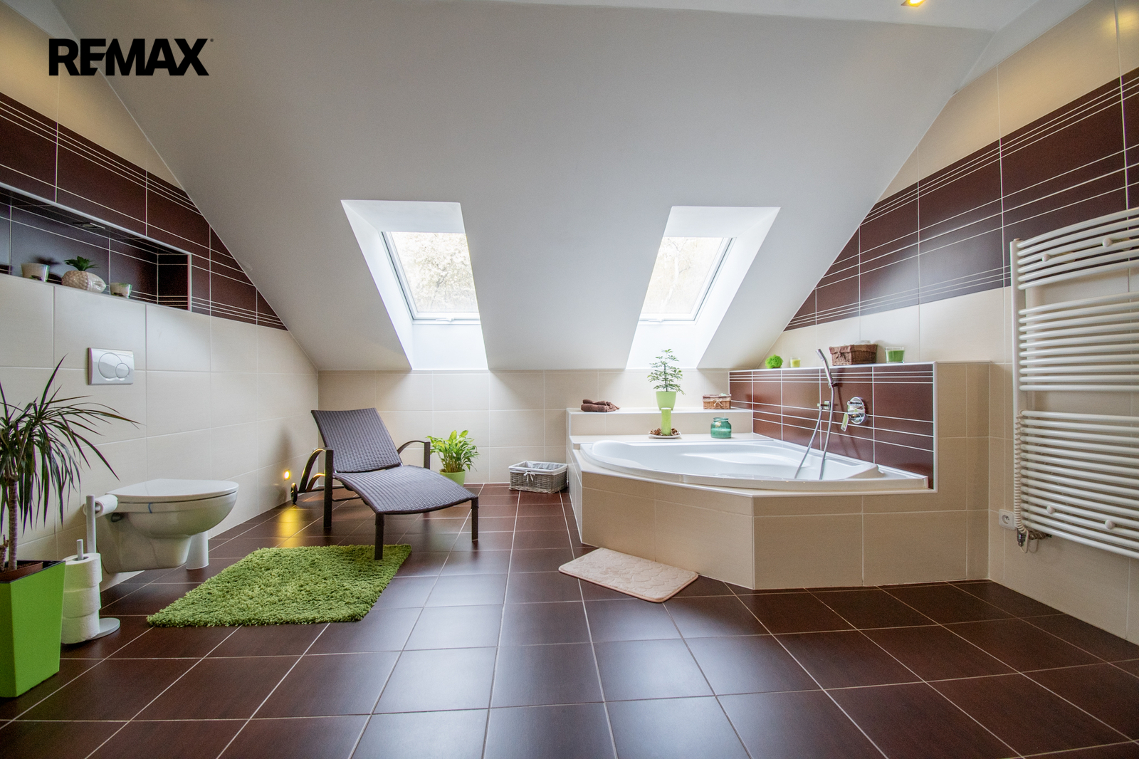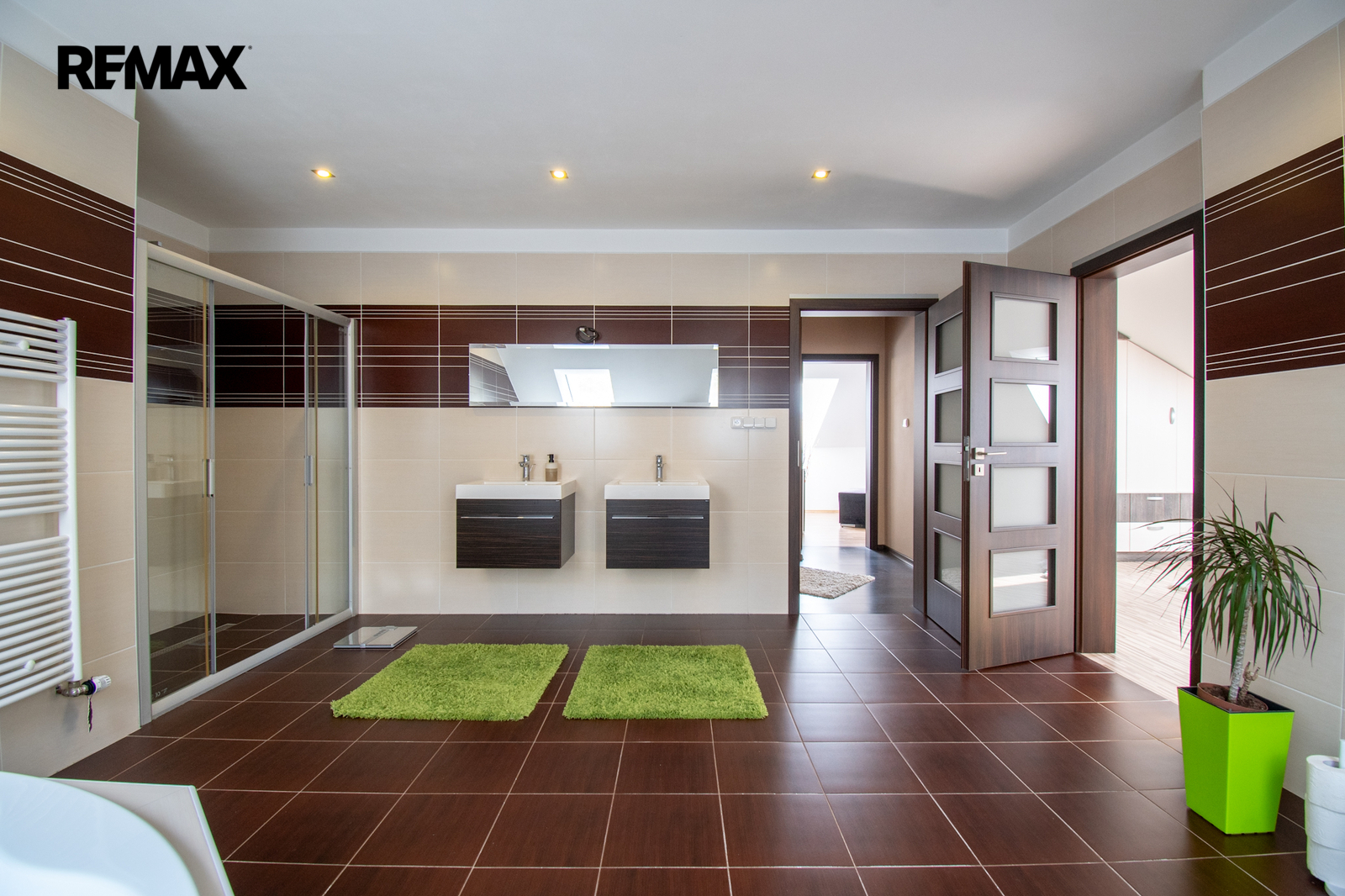 Dům nabízí dvě koupelny – menší v přízemí se sprchovým koutem a toaletou a druhou větší, prostornější v patře. Kuchyňská linka byla vyrobena truhlářen na míru a prostor kuchyně je prodloužen zastřešenou částí venkovní terasy.