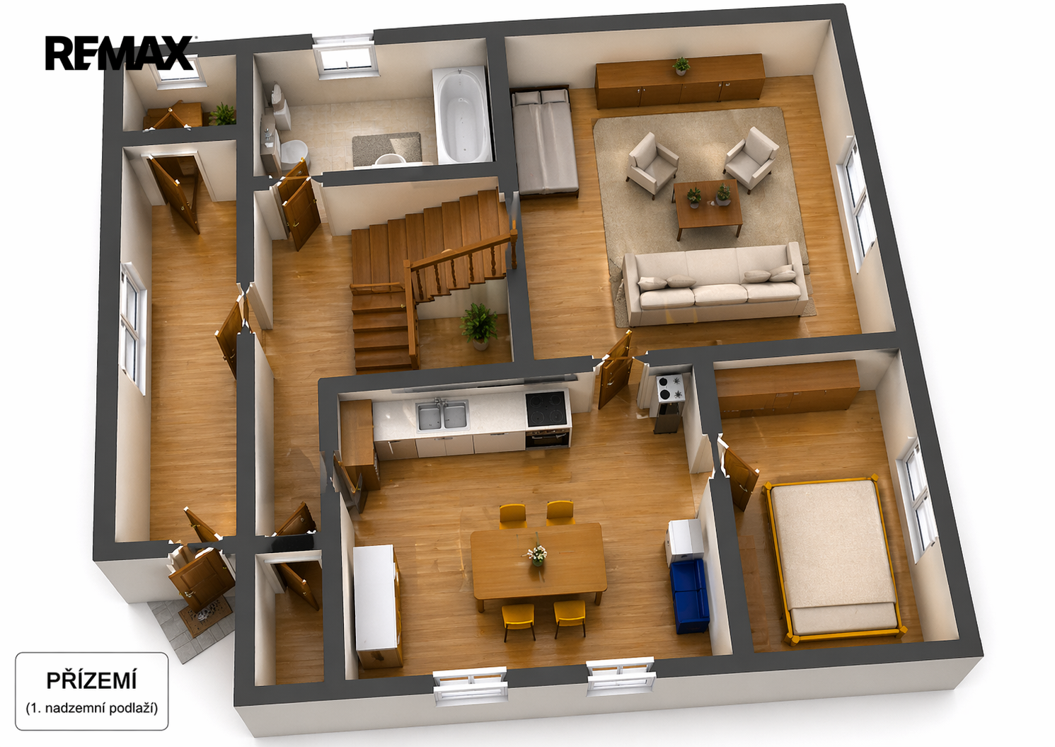 • Přízemí (2+1): Obývací pokoj (21 m²), kuchyň (16,5 m²), ložnice (10,3 m²), hala, koupelna, WC a spíž o celkové ploše přízemí 71 m².