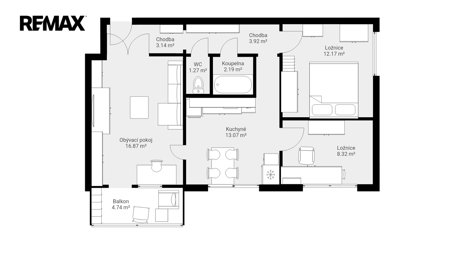 Dispozice bytu: kuchyně 12 m², předsíň 8 m², obývací pokoj 16 m², ložnice 12 m², dětský pokoj 8 m², koupelna 2,5 m², samostatné WC 1 m², spíž, lodžie a sklep.