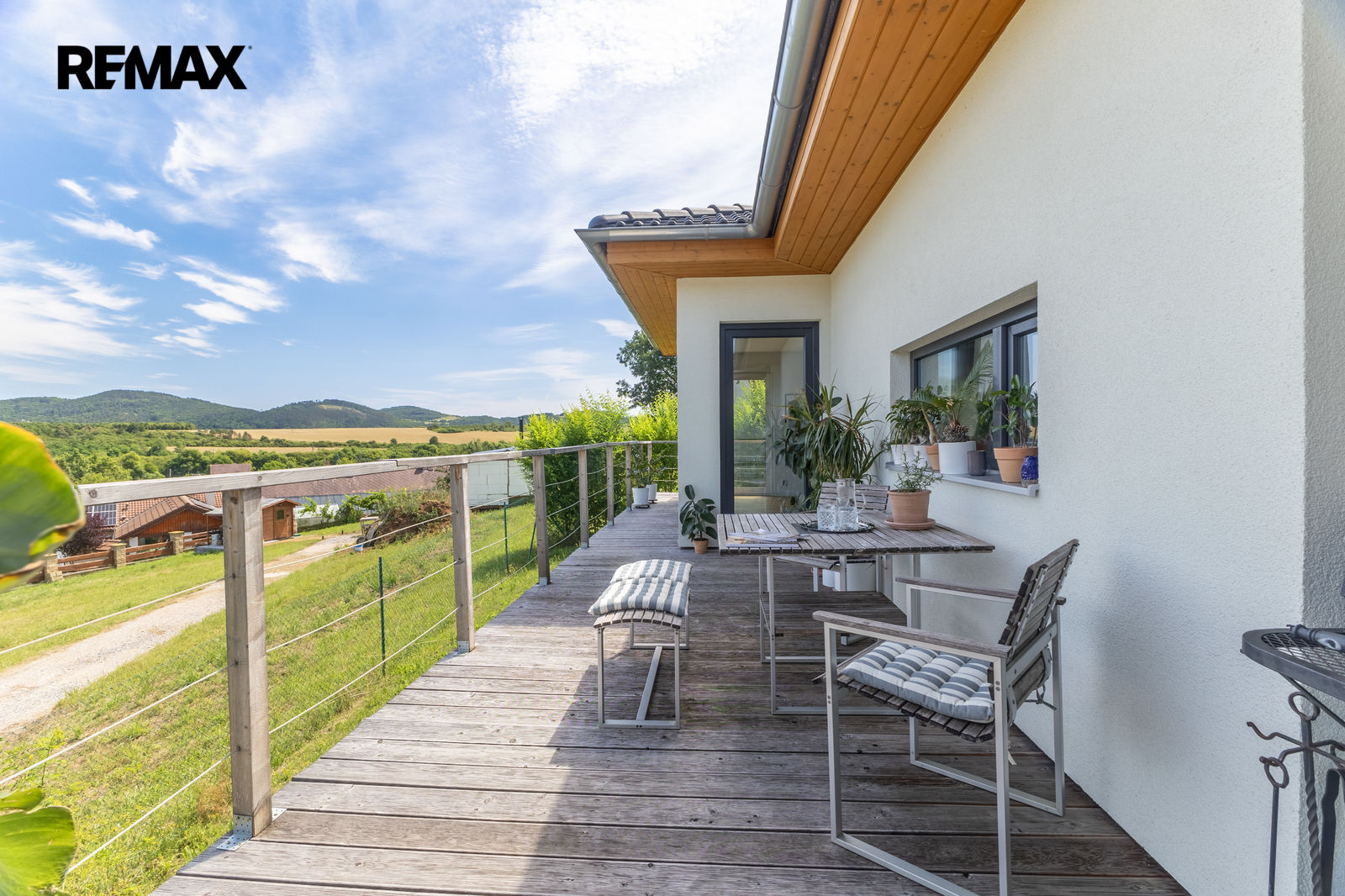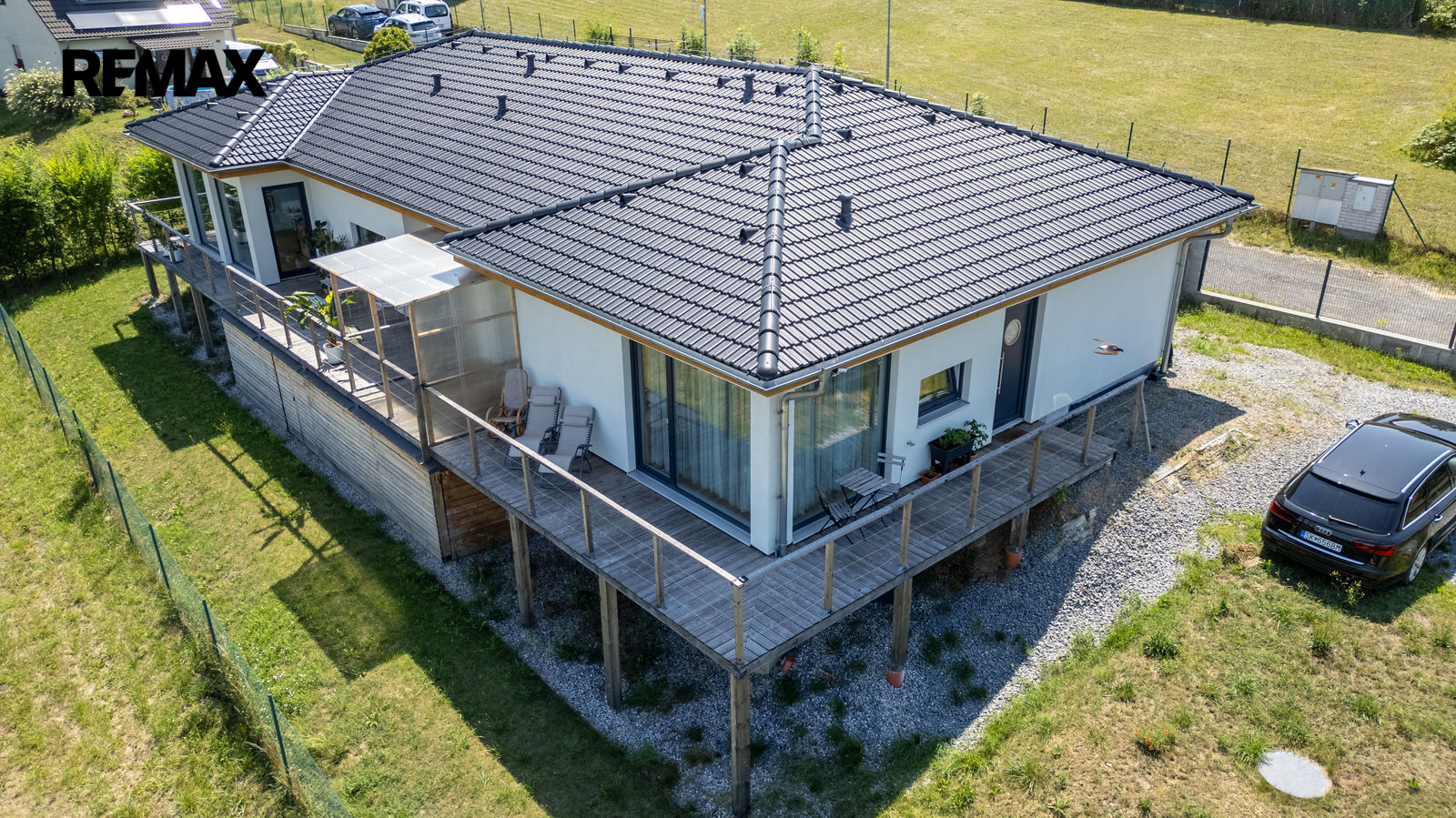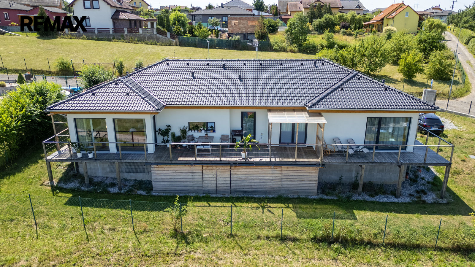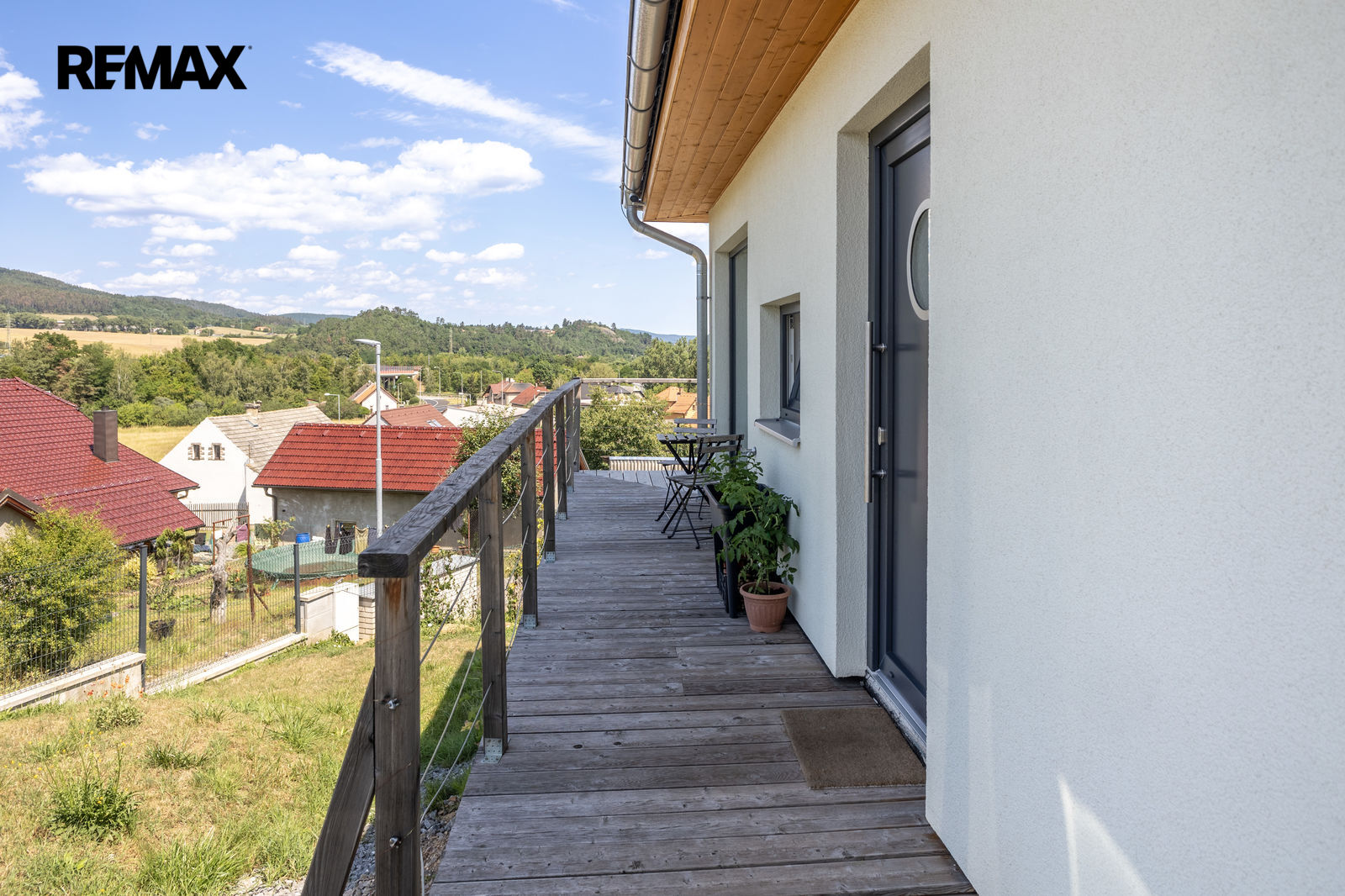 Tato kvalitní novostavba dřevěné konstrukce je rozložena do dvou bytových jednotek. První jednotka, v níž bydlí majitelé, má dispoziční uspořádání 4+kk se dvěma koupelnami, předsíní a technickou místností. Druhý byt s dispozicí 2+kk s jednou koupelnou a komorou majitelé pronajímají a činí tak celkový provoz domu profitabilním. Kolem celého domu je terasa (80 m²) z modřínového dřeva s výhledem do krajiny. Praktický sklep pod terasou nabízí mnoho úložného prostoru.