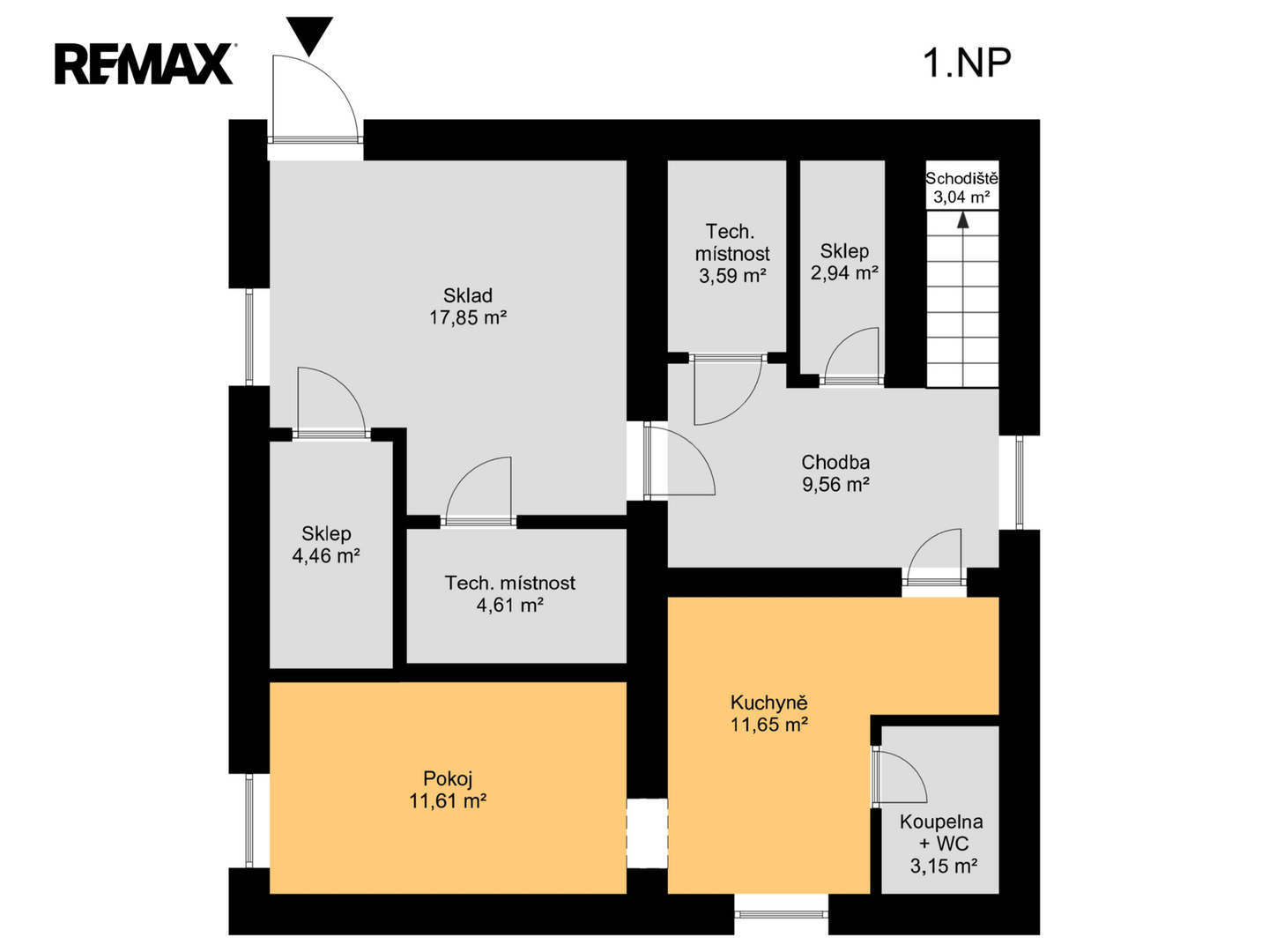 1.NP - Suterén o ploše 72,46 m² (bytová jednotka 2+kk) + technické zázemí a dílna.