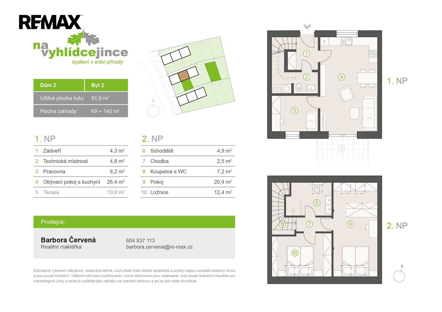 Budoucí byt označený jako B2 v novostavbě rodinného domu disponuje 2 NP a celkovou užitnou plochu 91 m2. Velkou výhodou je přímý vstup na předzahrádku o celkové ploše 69m2 s terasu (10,8 m2), která je vybavena bioklimatickou hliníkovou pergolou, k bytu bude k dispozici také příjemná zahrada o celkové výměře cca 140 m2 s nepřekonatelným výhledem na Plešivec a okolní kopce.