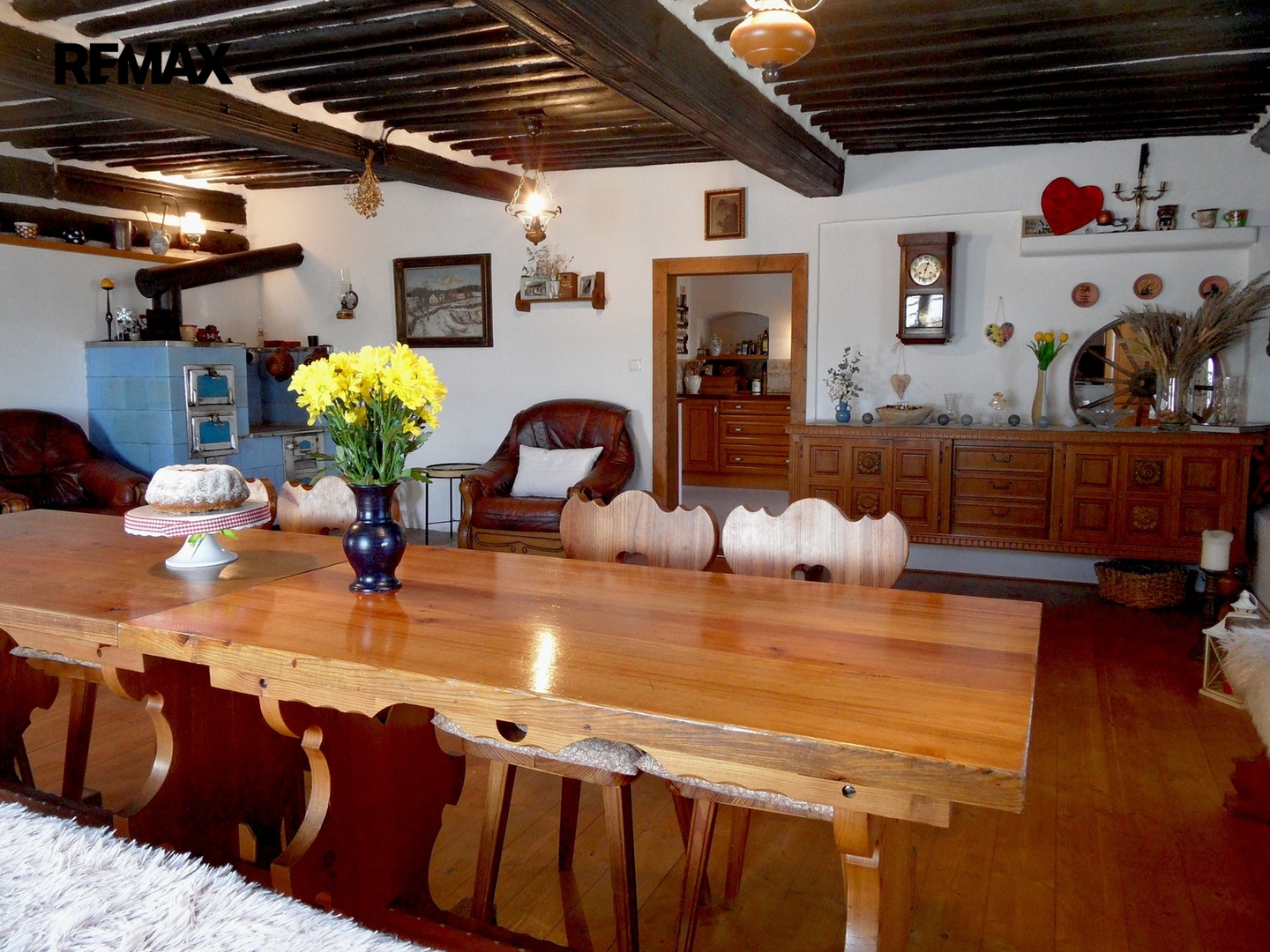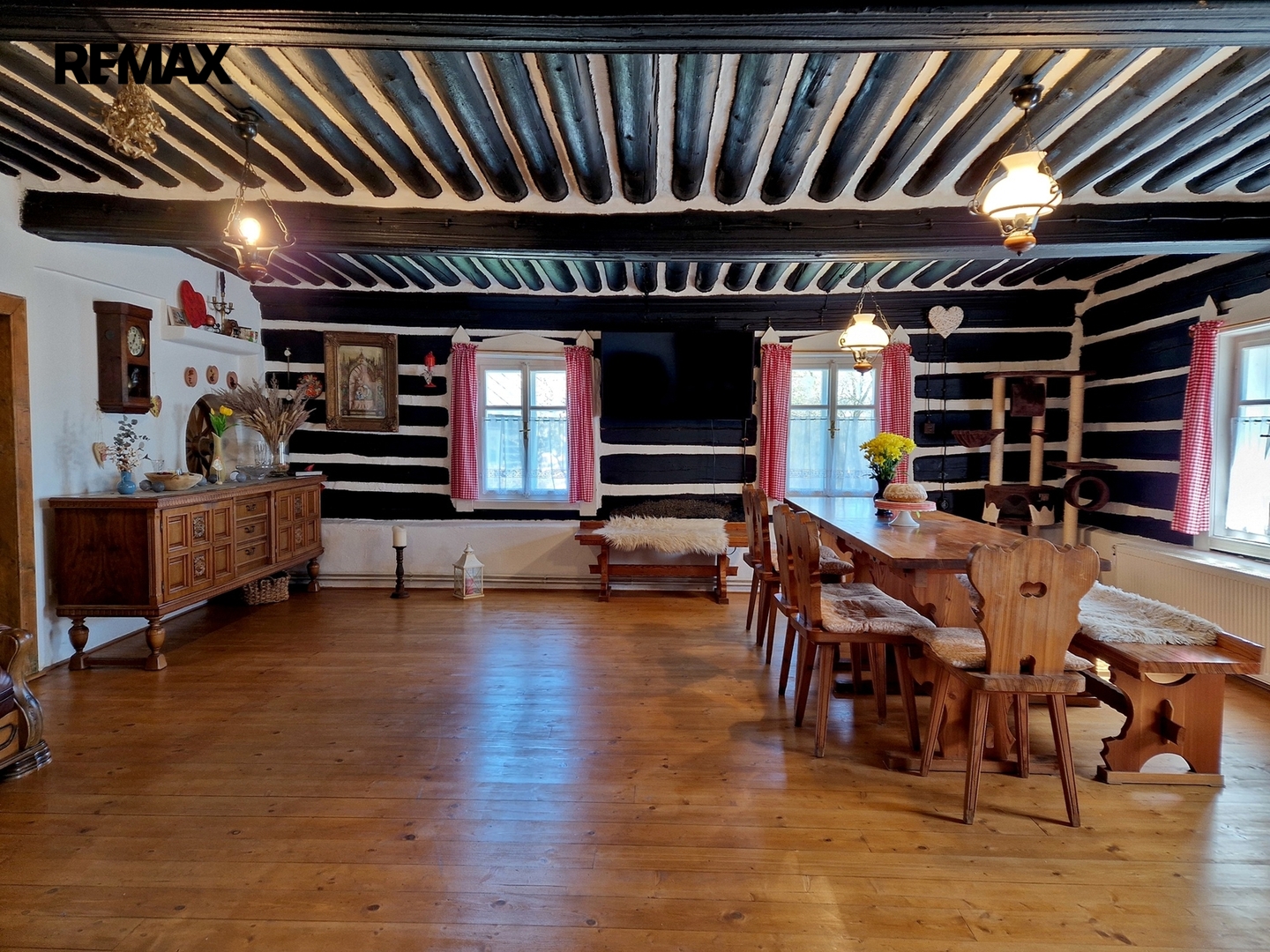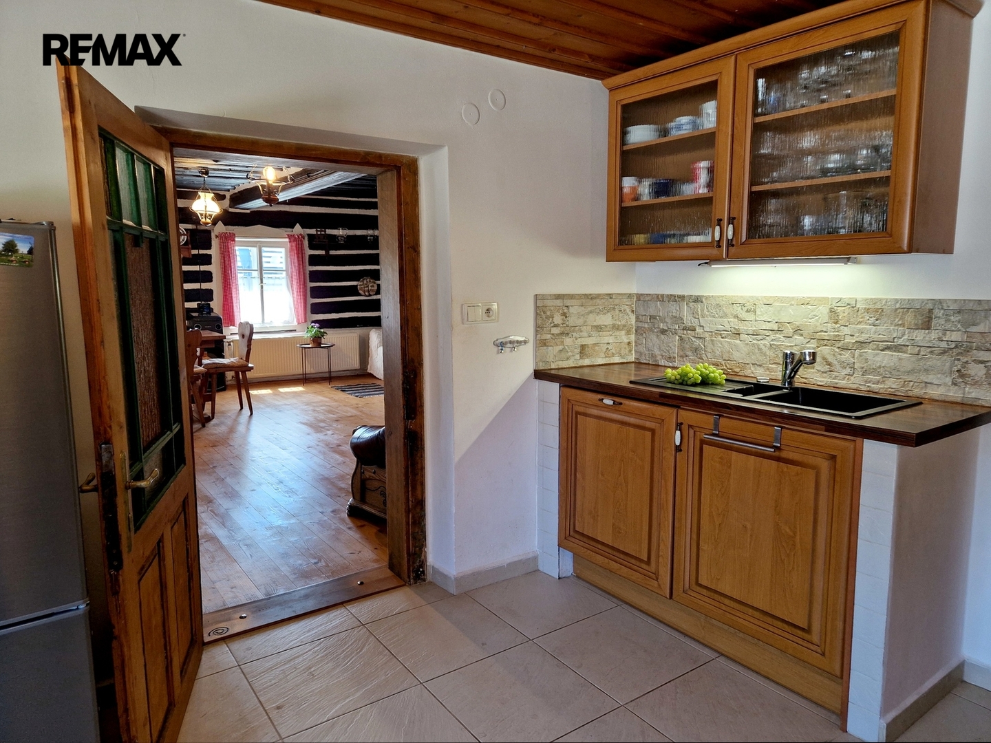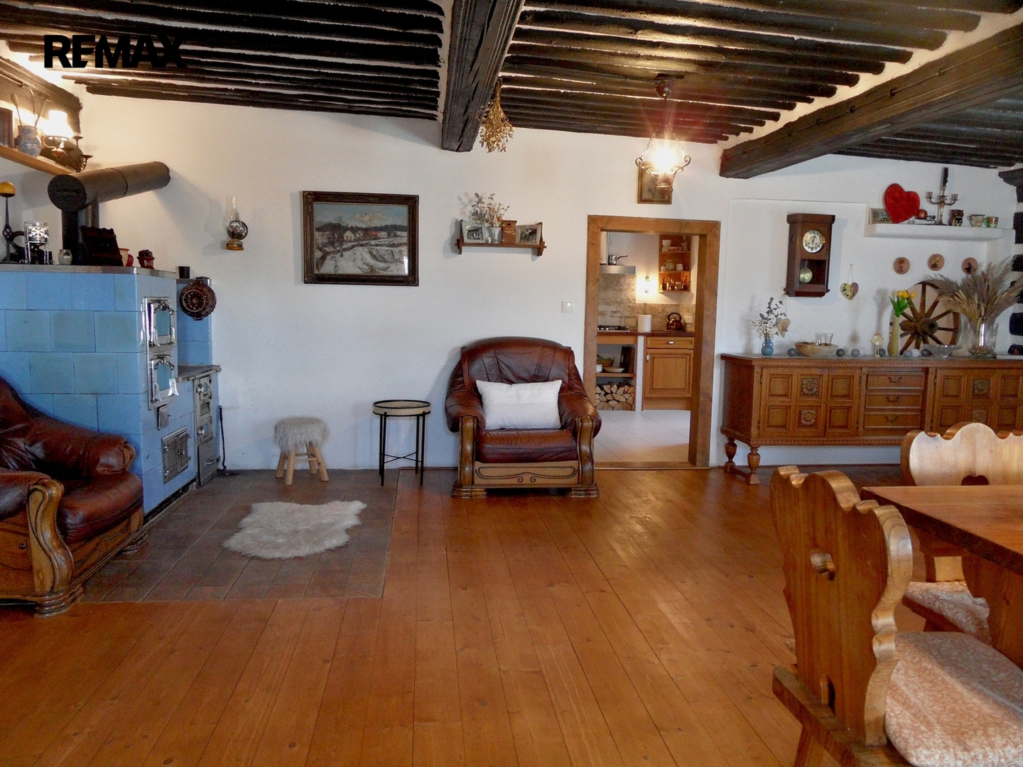 Dominantou domu je nádherná roubená sednice s tradičními kachlovými kamny, dřevěnými trámy a dřevěnou podlahou, ze které se vstupuje do stylové dřevěné kuchyně s prostornou spíží.