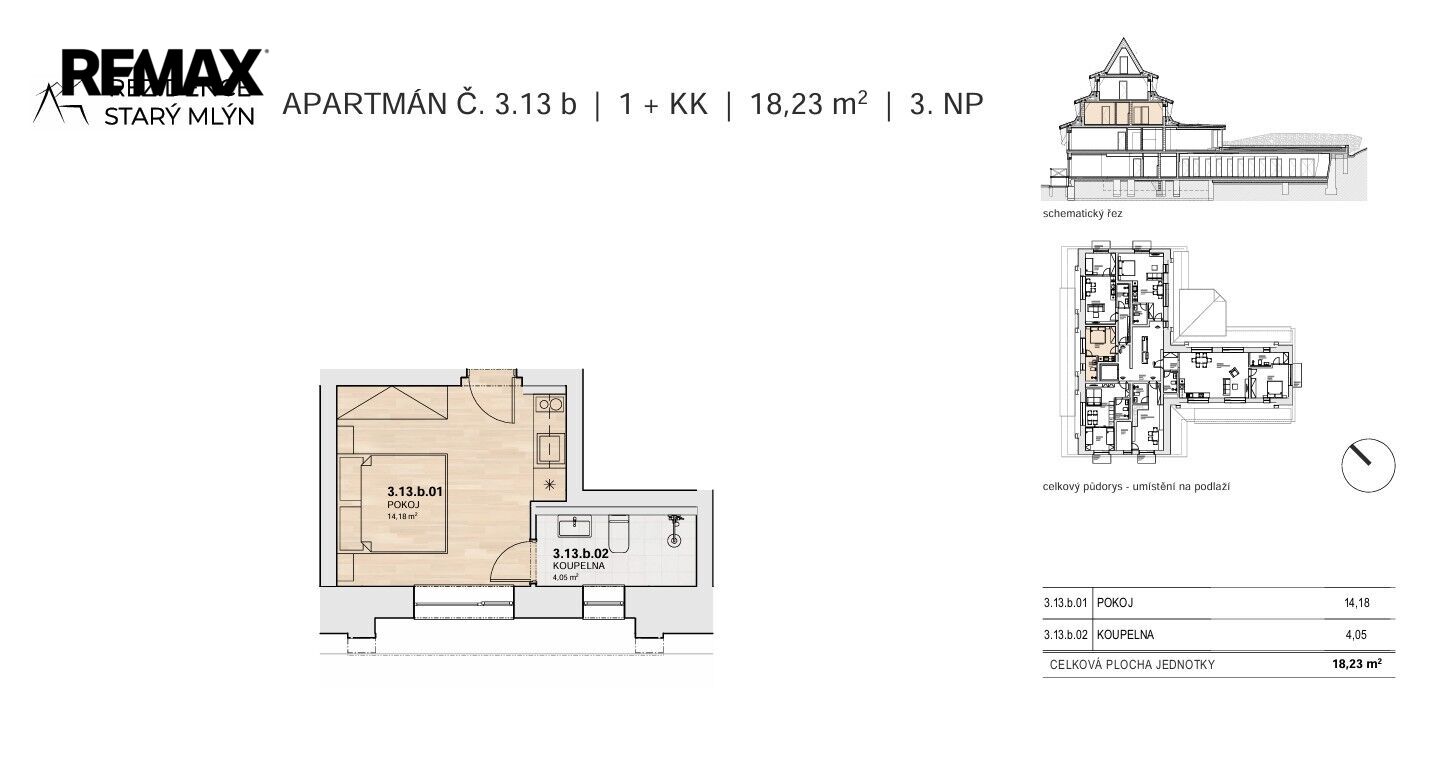 Prezentovaný apartmán č. 13b o dispozici 1+KK se nachází ve 3NP a disponuje podlahovou plochou 18,2 m². K apartmánu dále náleží privátní uzamykatelná kolárna + lyžárna (2,5m²), možnost využívání společného wellness. Cena za apartmán je uváděna včetně parkovacího stání (v hodnotě 400tis Kč) a DPH s možností odpočtu ve výši 21%. Aktuálně nabízíme voucher na kuchyňskou linku v hodnotě 100 tis Kč. Stavba byla již zahájena a plánované dokončení je do konce roku 2026.