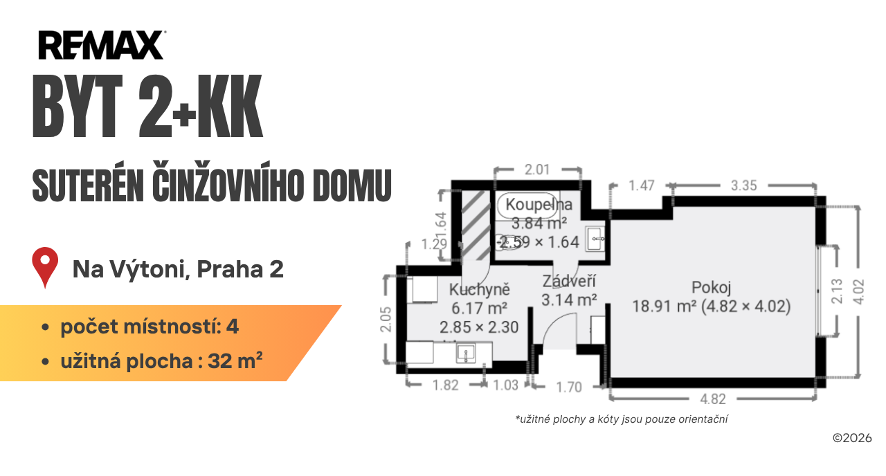 Nabízím k pronájmu praktický byt o dispozici 2+kk a celkové užitné ploše 32 m², který se nachází v suterénu udržovaného činžovního domu v jedné z nejžádanějších pražských lokalit – v ulici Na Výtoni, jen pár kroků od Vltavy a legendární Náplavky.