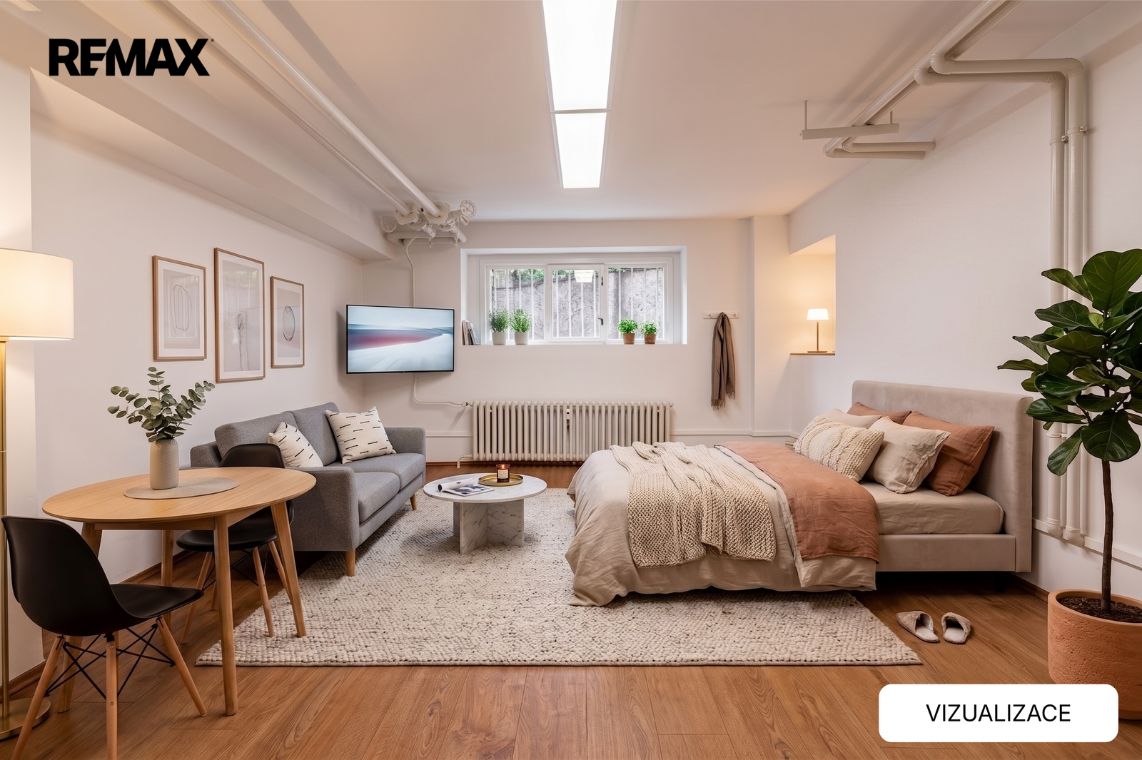Byt se skládá ze vstupního zádveří, hlavního pokoje (cca 19 m²), samostatné kuchyně, koupelny s vanou a "tajemné" komnaty sloužící jako úložný prostor. Kuchyně je vybavena novou kuchyňskou linkou se dřezem, volně stojícím sporákem s troubou a lednicí. Přísun denního světla a větrání zajišťuje trojokno, s jedním otevíratelným okenním dílcem, v kombinaci s umělým osvětlením. Byt je ideální jako startovací bydlení, pracovní byt, nebo jako zázemí pro studenty.