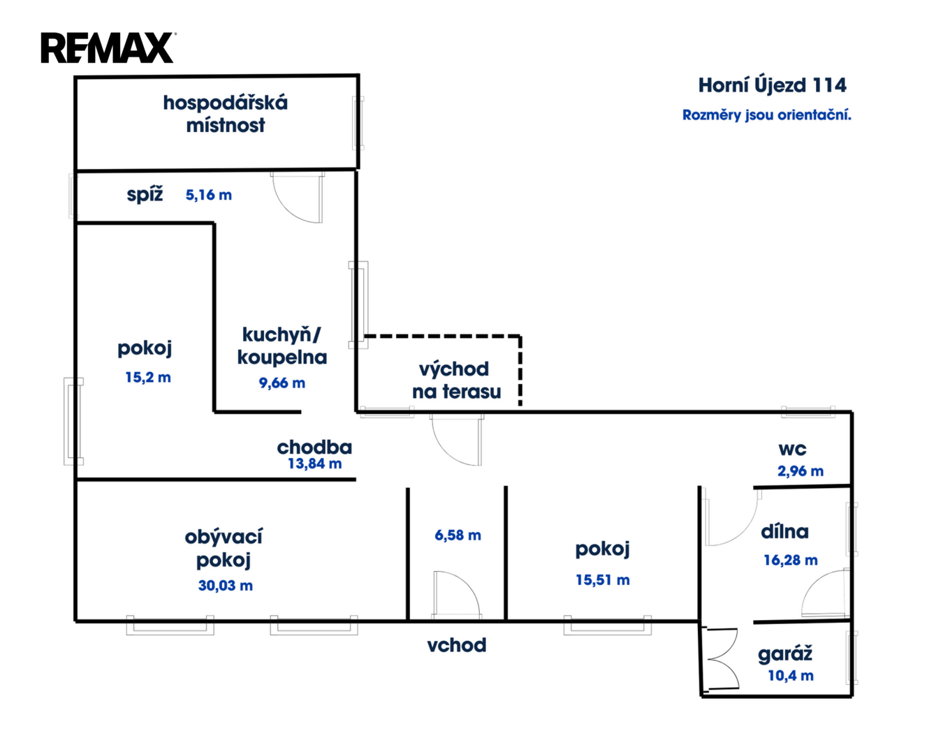 Zastavěná plocha domu včetně garáže a dílny je přibližně 126 m2. Samotná užitná plocha domu činí asi 99 m2. Zahrada za domem poskytuje dostatek prostoru na pěknou terasu pod rozkvetlou třešní (betonová deska pro terasu je už položená), zahradní domek pro děti, parkování pro několik aut nebo místo pro vaši představivost.