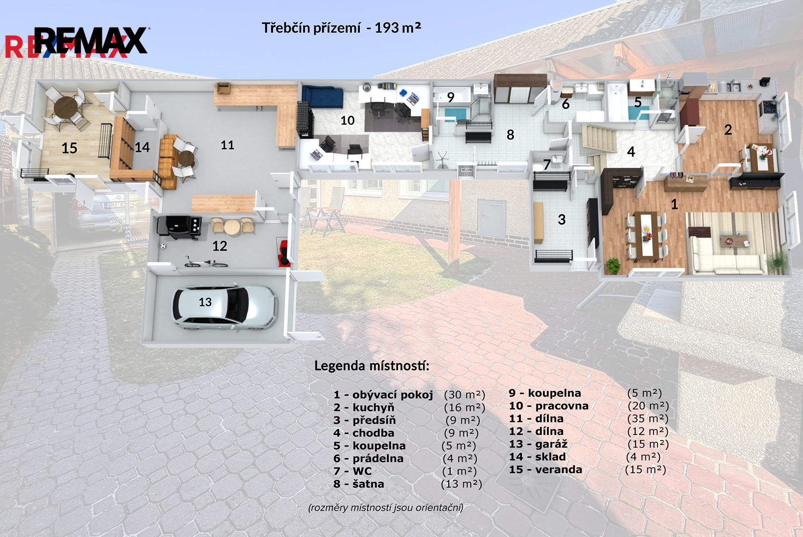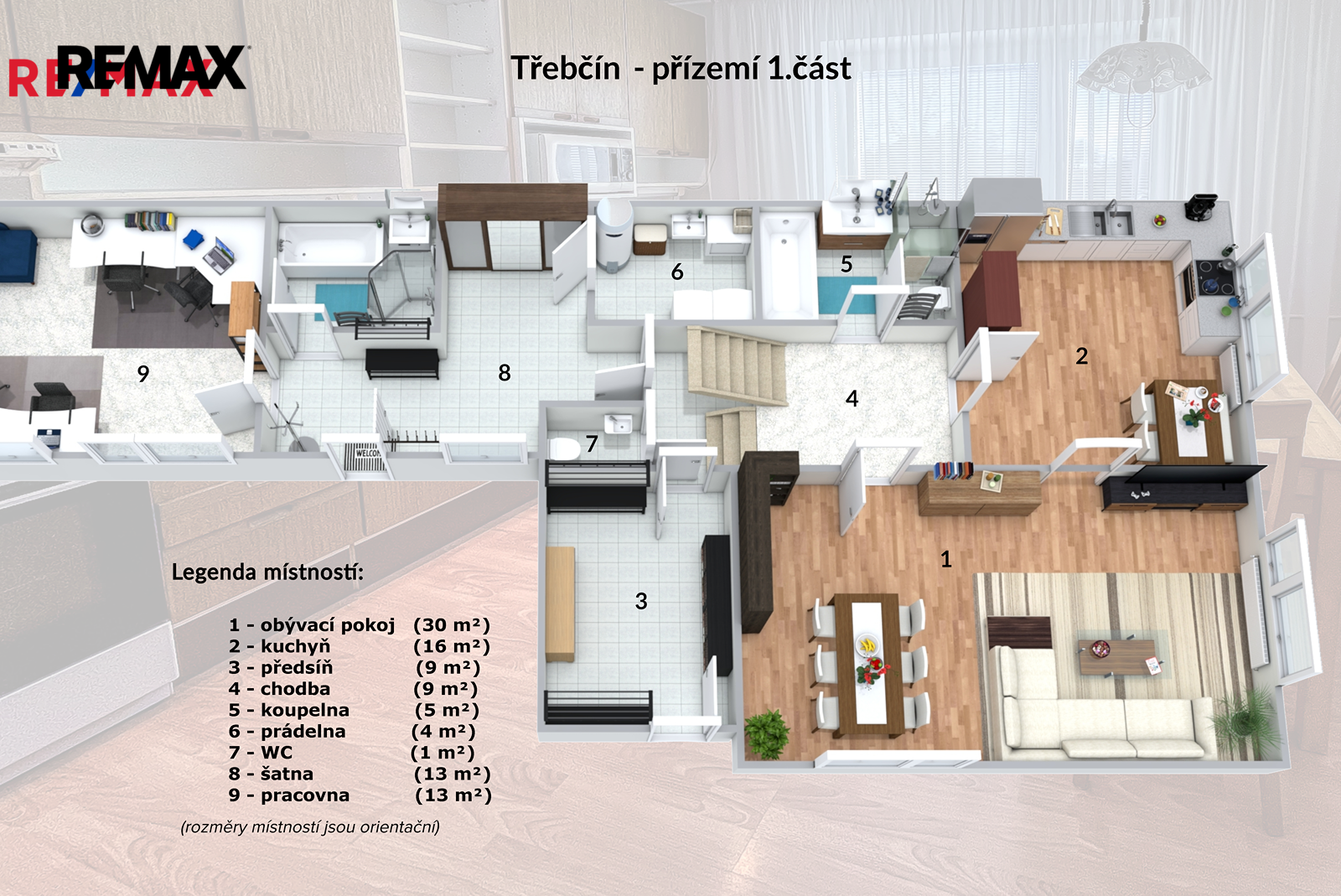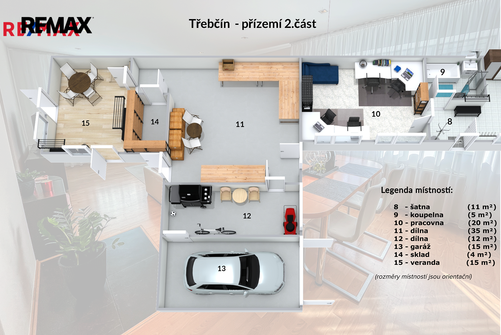 V exkluzivním zastoupení majitele nabízíme k prodeji dům se zahradou v Třebčíně nedaleko Olomouce. Vícepodlažní dům s půdou je částečně podsklepený s garáží, dílnou a skladovými prostory. Vytápění je ústřední s plynovým kotlem umístěným v suterénu a dále je provedena příprava pro krbová kamna. Dům je napojen na veřejnou kanalizaci, vodovod, plyn a elektřinu. V domě jsou plastová okna, laminátové podlahy a sádrokartonové podhledy. V 1. NP se nachází obývací pokoj s jídelnou, kuchyně, koupelna (vana, sprcha, umyvadlo, WC), vstupní hala, WC, prádelna. V přístavbě 1. NP se nachází pracovna, předsíň, šatna, koupelna (není dokončena, příprava pro sprchu, umyvadlo a WC). V této přístavbě lze řešit samostatnou obytnou jednotku nebo prostor pro podnikání. Ve 2.NP se nachází 3x ložnice, koupelna (sprcha, umyvadlo), skladový prostor s možným užitím jako šatna. Půda je svojí rozlohou a charakteristikou určená k případné půdní vestavbě.