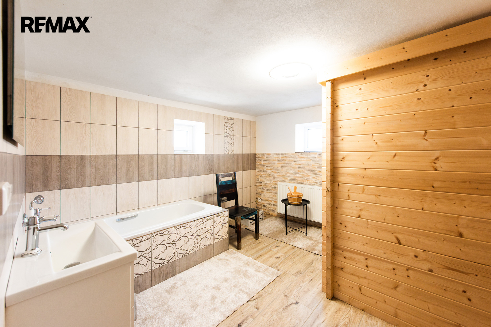 Dům je navíc z části podsklepen s plochou 50 m2. Tyto sklepní prostory rovněž prošly kompletní, důkladnou rekonstrukcí a umožňují tak více než jen skladovací a technické využití. Prostory tvoří společenská místnost, samostatný pokoj, prostorná koupelna / prádelna se saunou, technická místnost s pračkou a sušičkou.