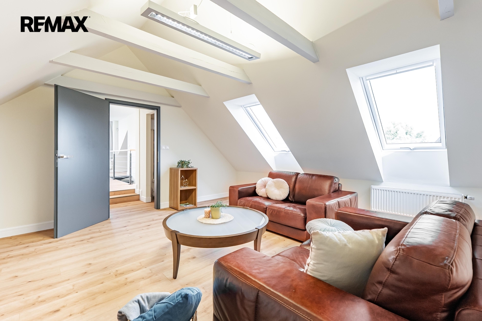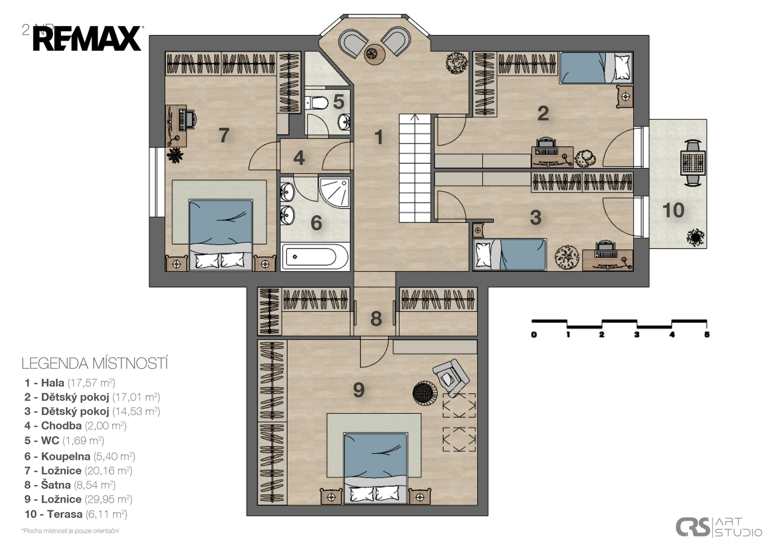 Horní část nemovitosti poté nabízí relaxační část, kde se nachází 2 dětské pokoje, 2 ložnice a šatny s koupelnou a WC.