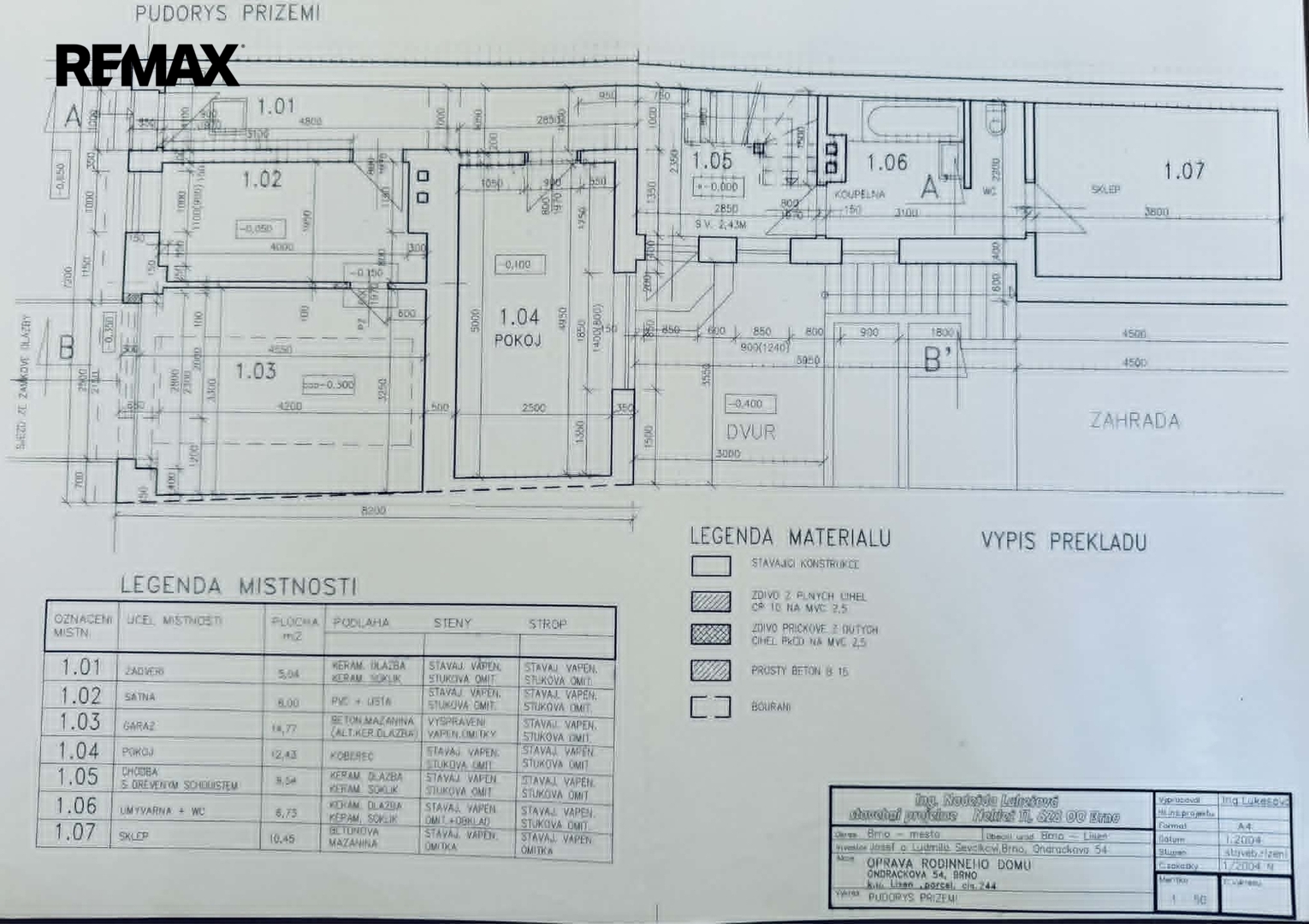 Dispozice: 1NP: vstupní chodba (5,04 m2), pracovna (8 m2), pokoj (12,43 m2), chodba se schodištěm a vstupem na dvorek (9,54 m2), koupelna + WC (6,73 m2), sklep (10,45 m2), garáž (14,77 m2).
