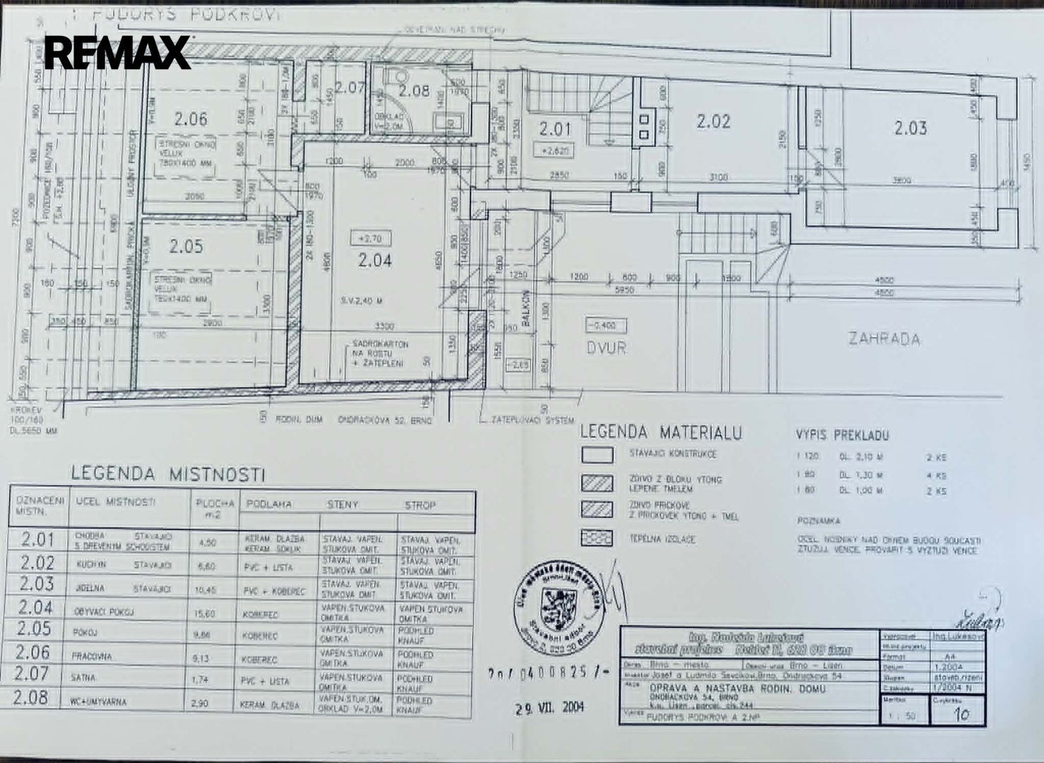 2NP: chodba (4,5 m2), kuchyně (6,6 m2), jídelna (10,45 m2), obývací pokoj (15,6 m2), podkrovní pokoj (9,86 m2), podkrovní pokoj (9,13 m2), šatna (1,74 m2), koupelna s WC ( 2,9 m2).