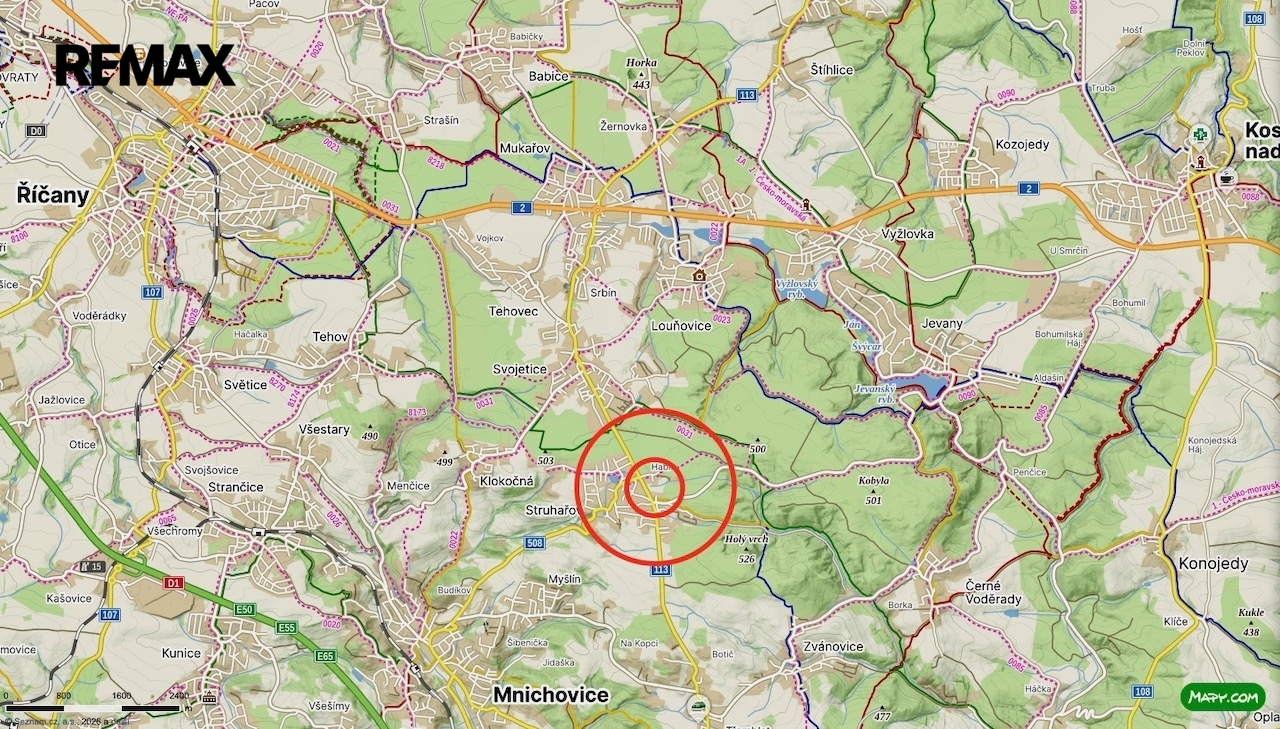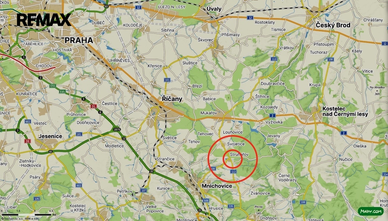 Dopravní dostupnost: Praha 24 km metro A i C, vlak Mnichovice i Říčany, PID: Autobusová zastávka cca 300 m se spojem na vlakové nádraží (4 km) i přímo na Prahu.