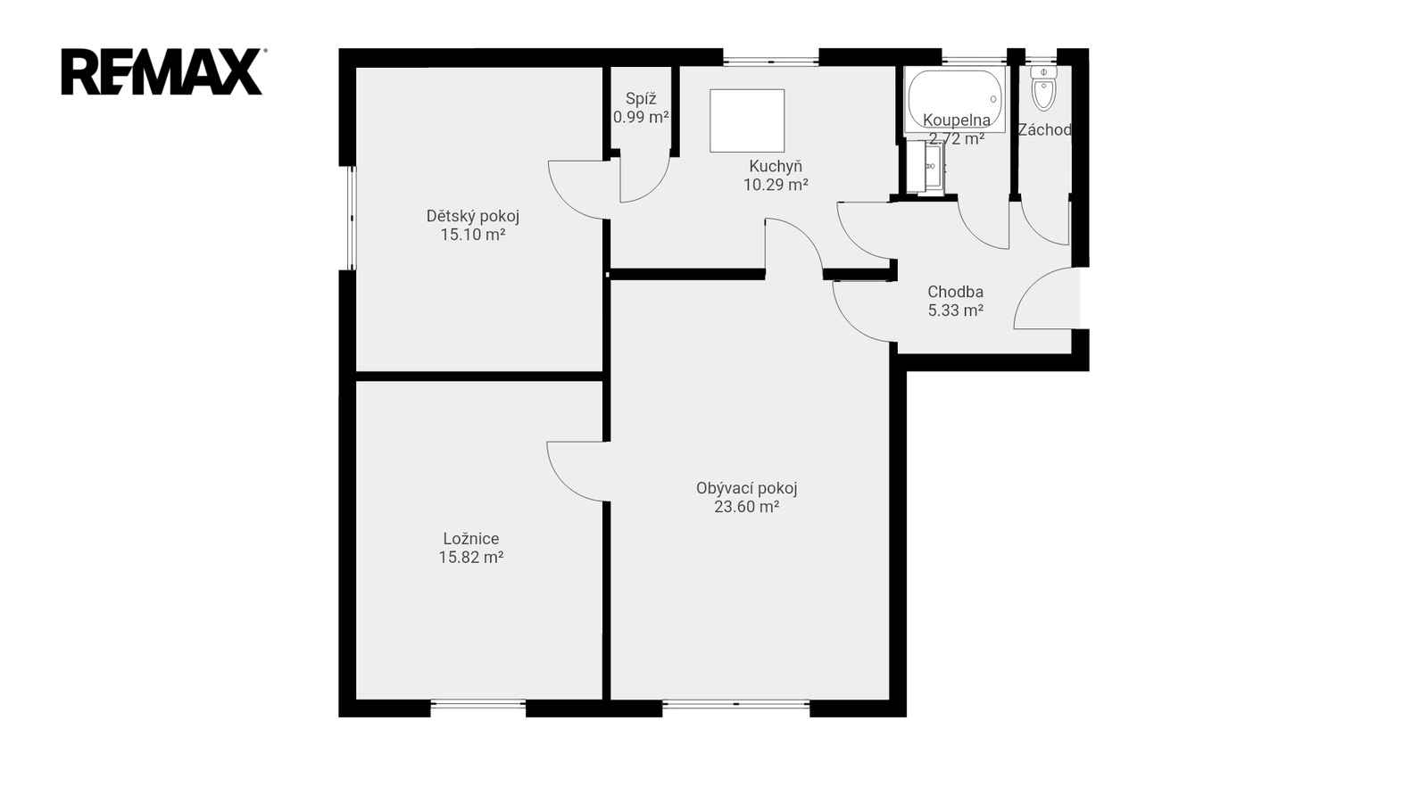 Současná dispozice bytu nabízí kuchyni o výměře 10 m², světlý obývací pokoj 22,8 m², dva samostatné pokoje o velikosti 14,8 m² a 14,7 m², dále spíž 1,4 m², vstupní chodbu 5,9 m², samostatné WC 1,5 m² a prostornou koupelnu s vanou 8,8 m².