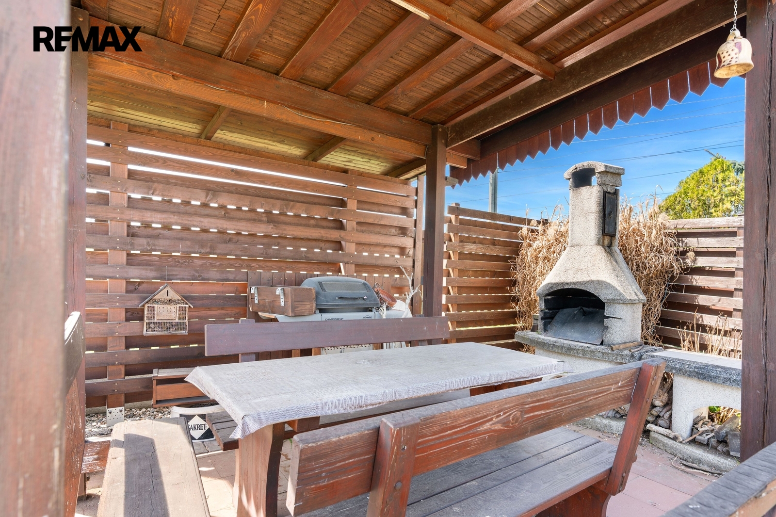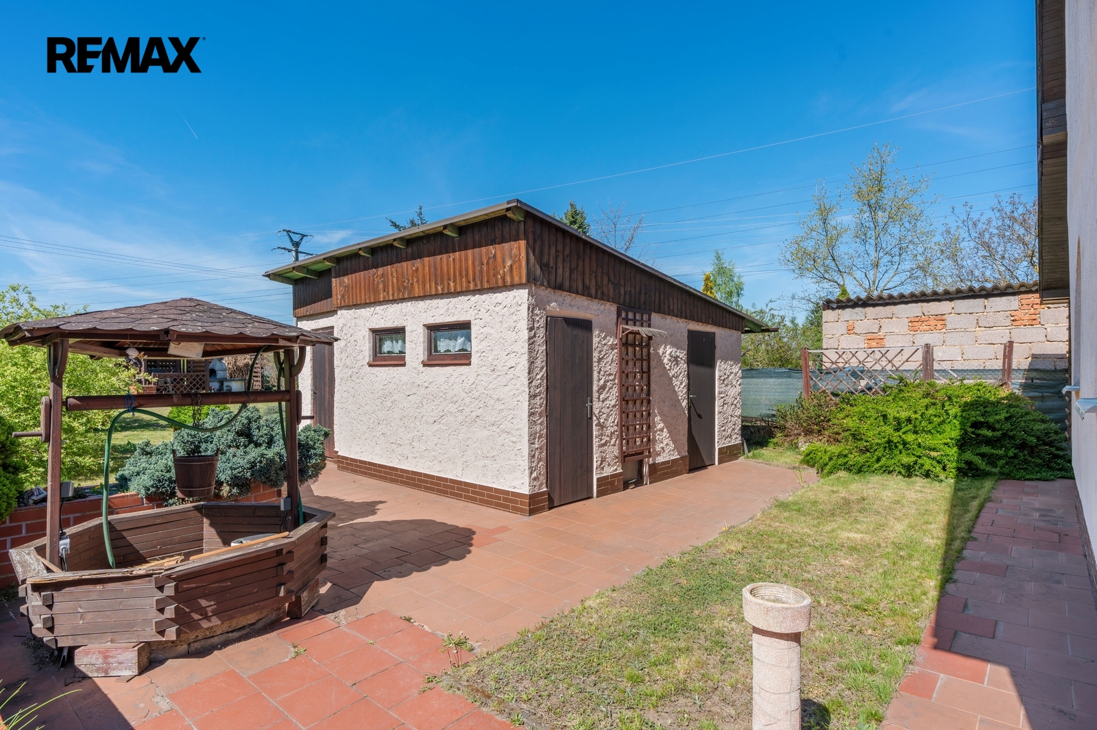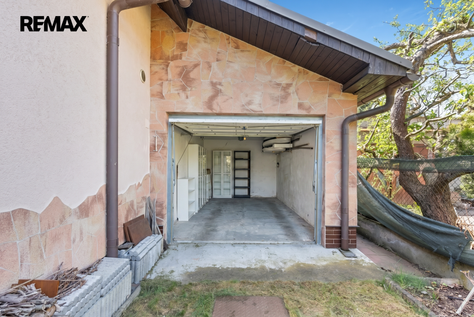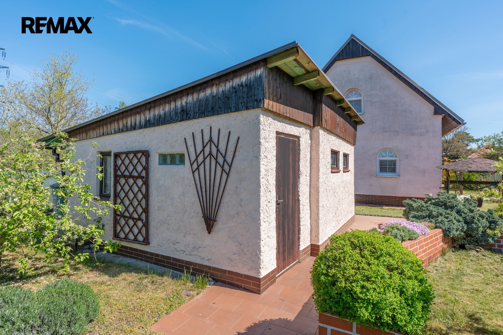 Na pozemku pohodlně zaparkujete čtyři auta, další parkování je možné v ulici. Zahrada je pravidelně udržovaná, má jihozápadní orientaci a nabízí zastřešené posezení, okrasné jezírko, vzrostlé dřeviny i samostatný podsklepený zahradní dům využívaný jako dílna a sklad.